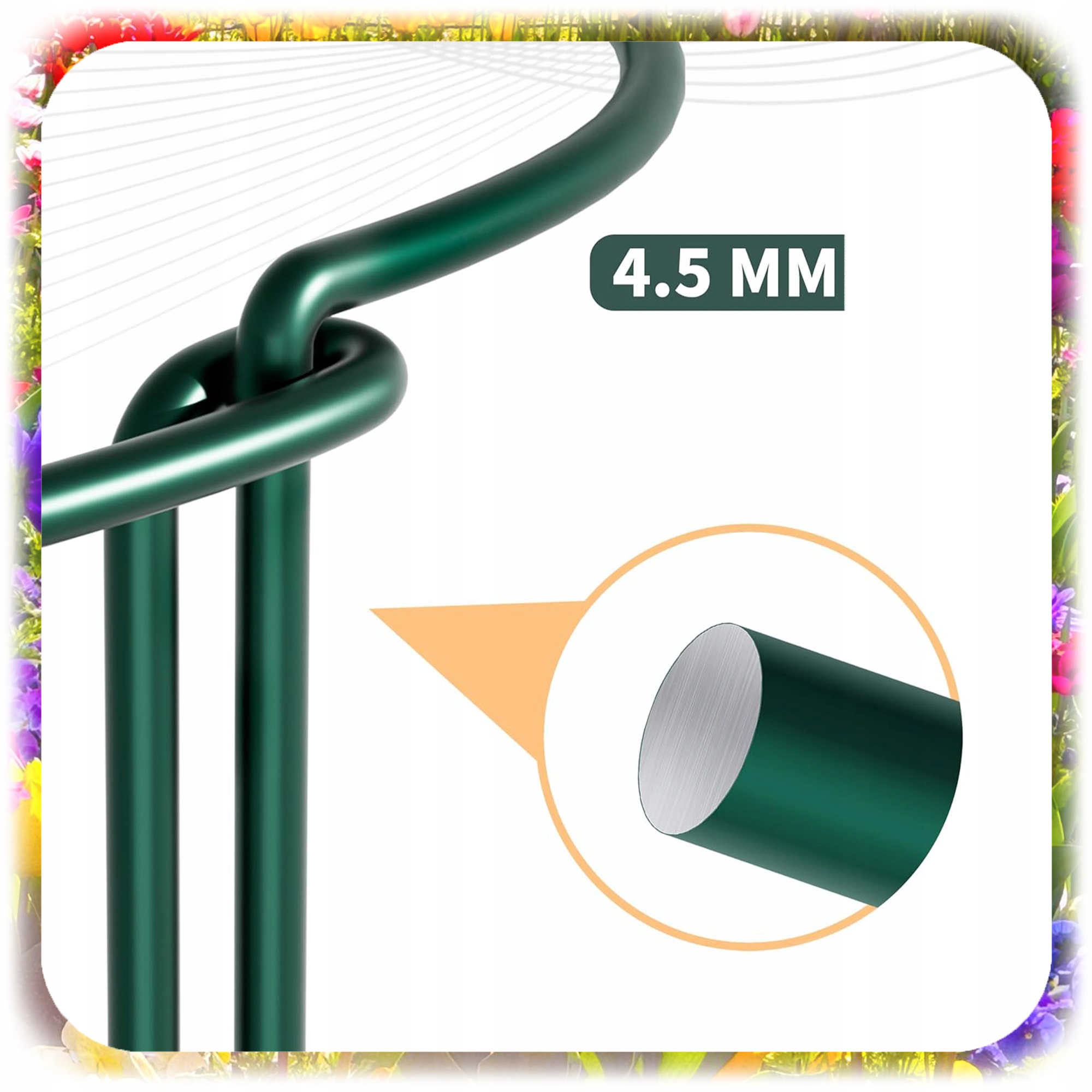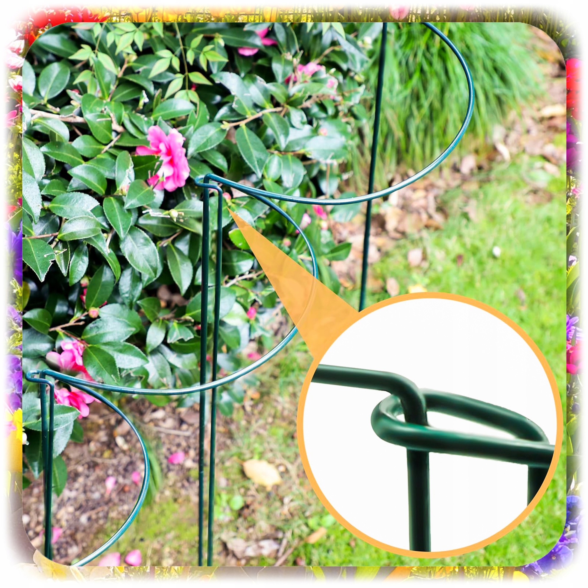 Опочки сделаны из металлической проволоки, покрытой защитным покрытием зеленого цвета, благодаря тому, что они идеально сочетаются с растительностью и в то же время устойчивы к дождю, влаге и ржавчине. Поддержка земли вокруг завода. Легкий дизайн означает, что сборка занимает буквально несколько секунд.