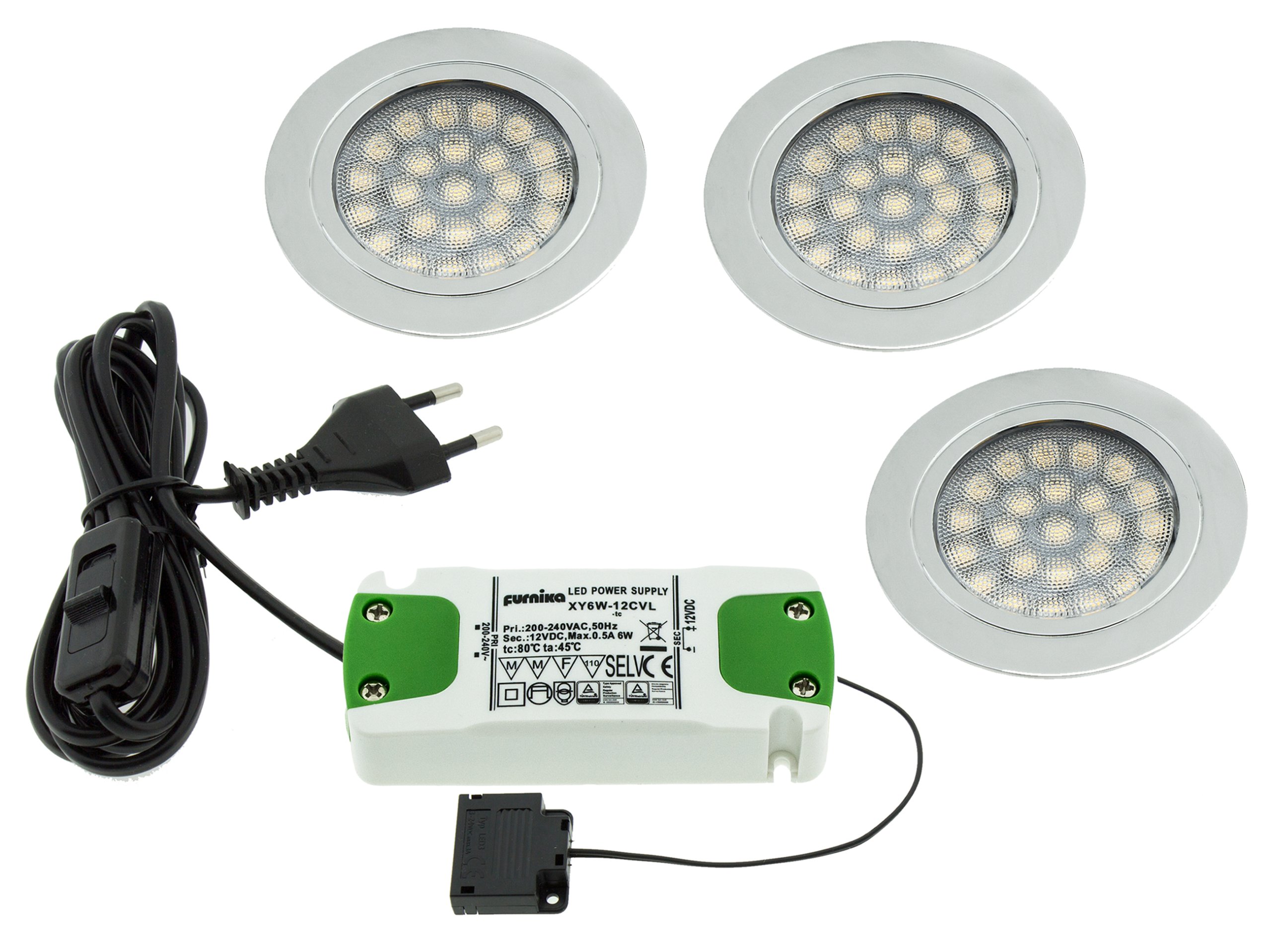 Комплект из 3-х КРУГЛЫХ светодиодных светильников с блоком питания 6Вт — современное решение для освещения встроенных мебельных щитов, оснащенных светодиодами.