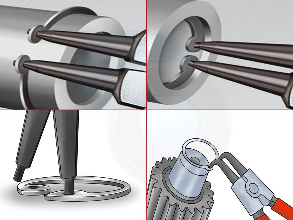 Щипцы для замков Seger используются для сборки и демонтажа стопорных колец. Существует 2 типа этих защит: внутренняя (расширяющаяся внутри втулки) и внешняя(зажимающая, снаружи вала).