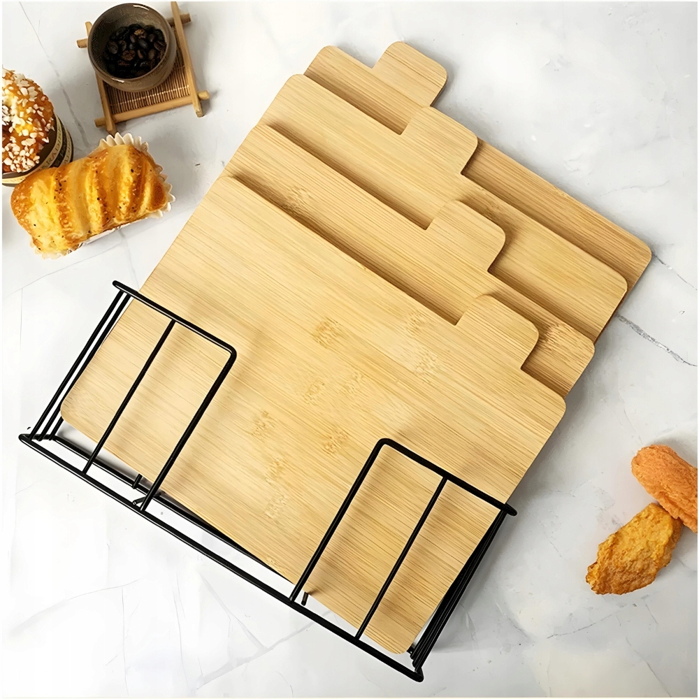 Благодаря практичной черной металлической подставке доски всегда под рукой и собраны в одном месте. Изготовленные из натуральной древесины бамбука, они не только прочны, но и экологичны. Толщина и функциональность досок делают их универсальным кухонным инструментом, идеальным как для нарезания, так и для подачи блюд.