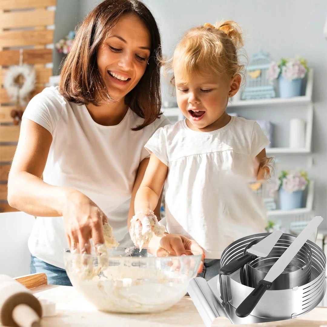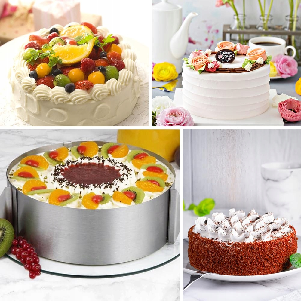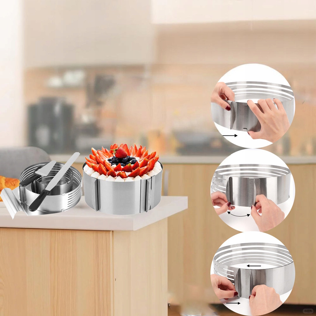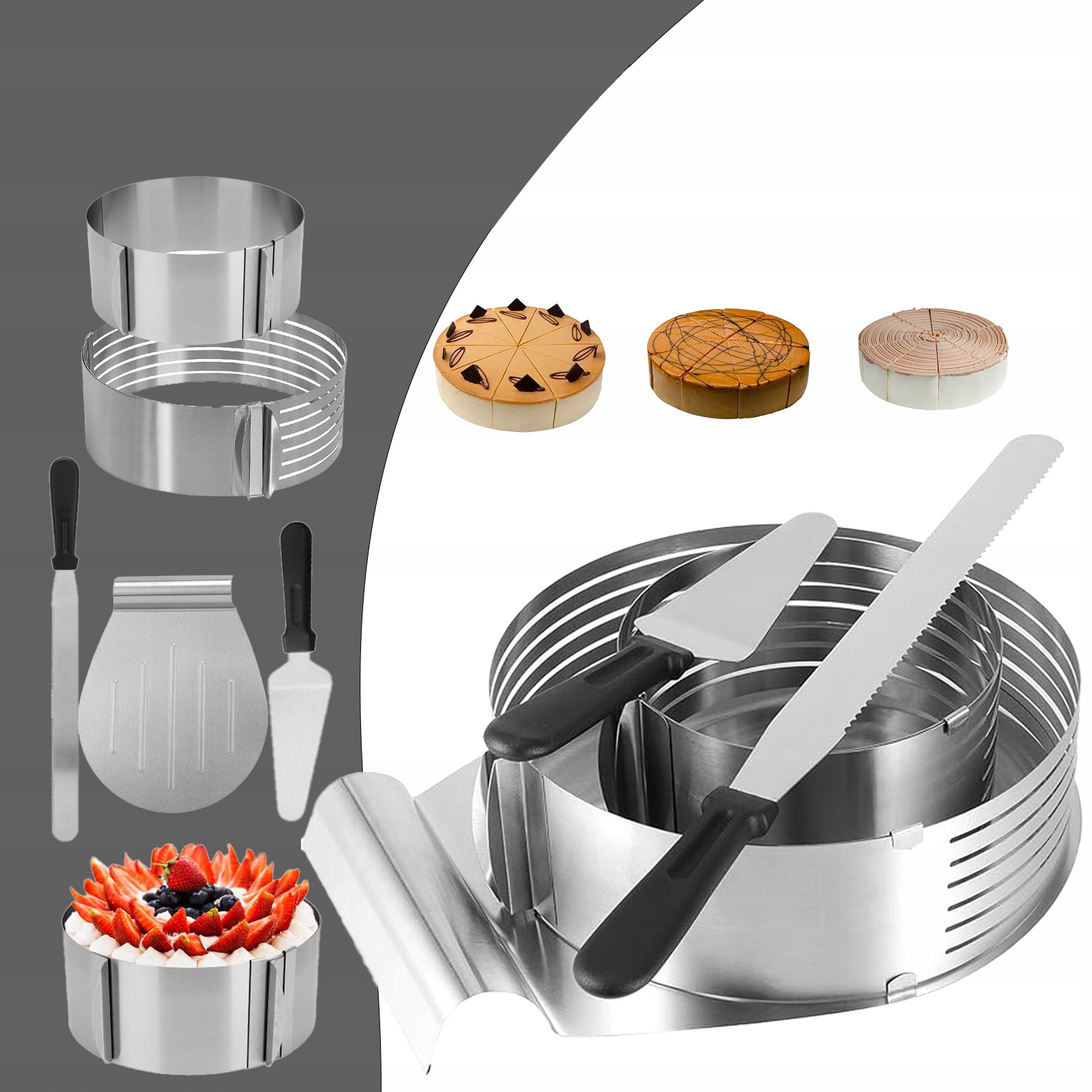 🍞【Регулируемое кольцо для торта】Наше регулируемое кольцо для торта имеет 7 направляющих на разной высоте, что позволяет идеально разделить коржи. Благодаря регулируемым размерам он обеспечивает максимальную гибкость.