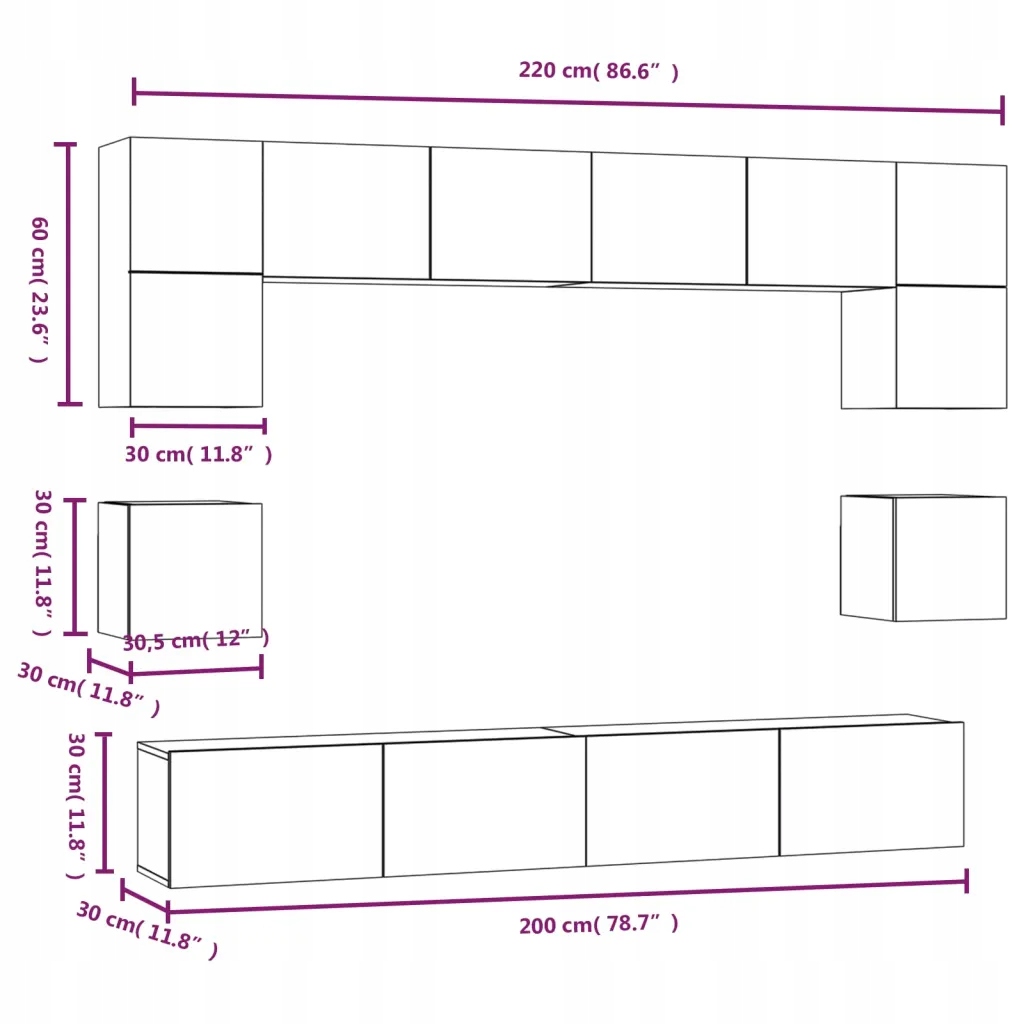- 2 x ТВ -шкаф: 30,5 x 30 x 30 см (ширина x глубина x высота)