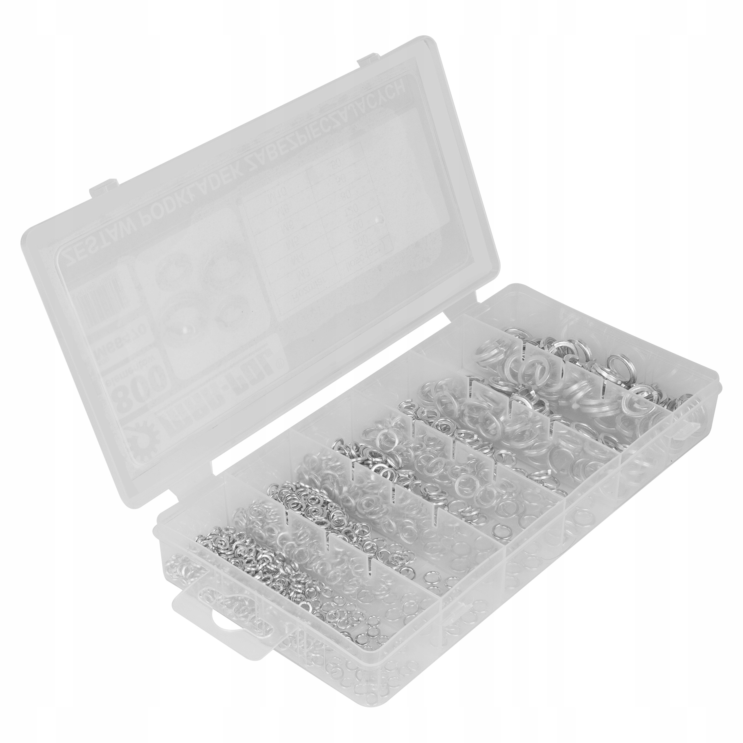 Практическая, вместительная упаковка с отделениями содержит800 штук предохранительных шайб. Ниже представлены отдельные элементы набора: