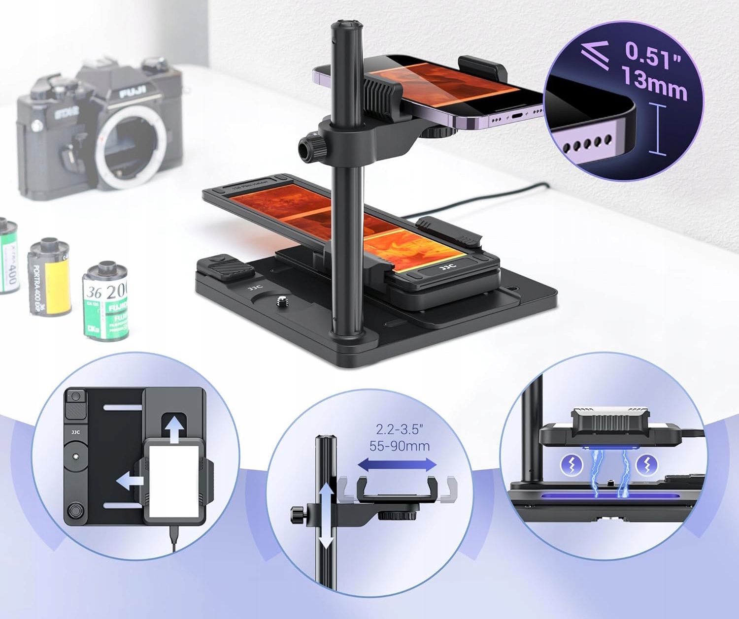 【Широкая совместимость】 Набор работает как с 35 мм, так и с 120 фильмами. Поместите фильм в ручку, а затем поверните его в панели подсветки. Держатель Spring Phone (для смартфонов с шириной от 2,2 до 3,5 "/55-90 мм) удобен и легко регулируется, что позволяет быстро схватить и выпустить. Держатель телефона также позволяет регулировать вертикальный стержень на стержне, чтобы адаптироваться к различным фокусным расстояниям смартфонов.