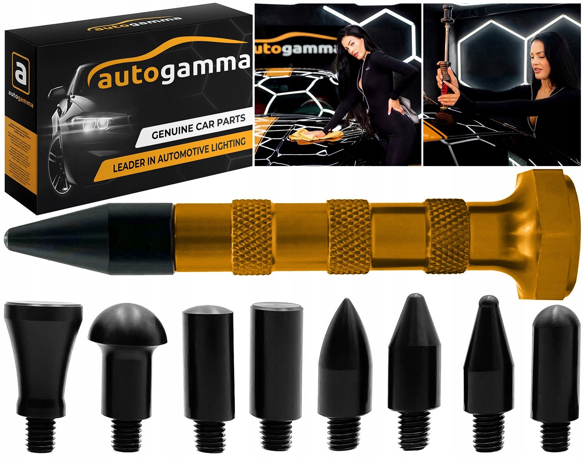 Предлагаемый комплект состоит из перфоратора и 9 сменных насадок с различной формой головок для удаления вмятин, образовавшихся на кузове автомобиля. 11 различных форм позволяют легко адаптировать соответствующий адаптер к форме кузова. Это дает возможность ремонтировать как маленькие, так и большие вмятины.