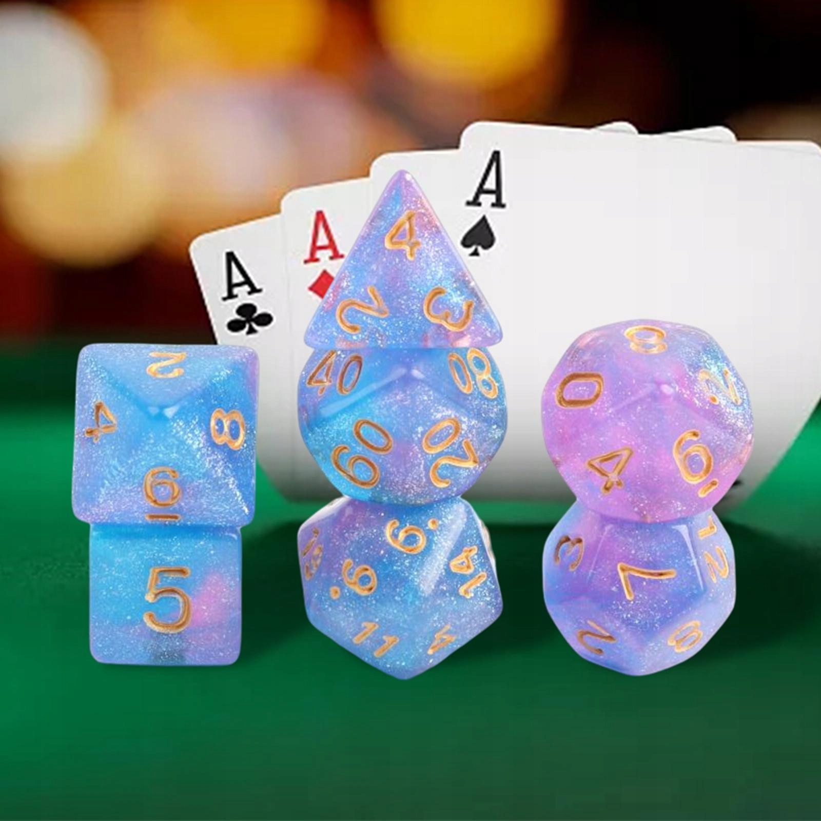 Многостенный: с 7 разными : D4, D6, D8, D12, D20, D10 (номер 0-9), еще один D10 (номер 00-90).