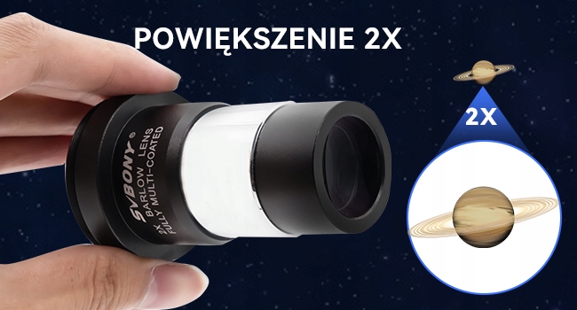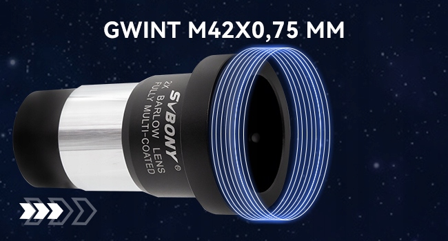 Линза Барлоу имеет наружную резьбу T/T2 (M42x0,75 мм); Легко подключите зеркальную или зеркальную камеру к телескопу с помощью адаптера с Т-образным кольцом, который продается отдельно. Предоставляет решения для съемки планет и глубокого космоса.