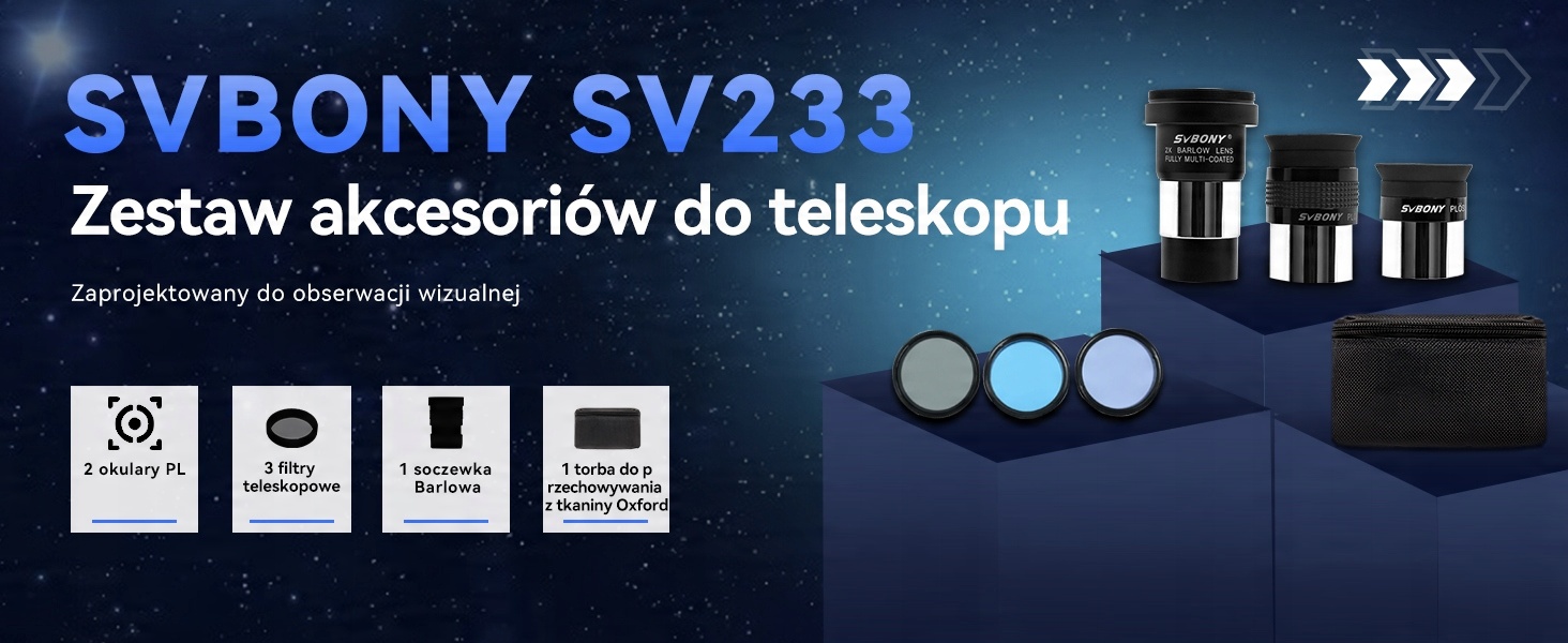 - В комплект аксессуаров к астрономическому телескопу SV233 входят: два окуляра Plossl размером 1,25 дюйма; 2 линзы Барлоу; которые можно использовать визуально или фотографически; три фильтра для окуляров и переносная сумка; подходят для начинающих астрономов.