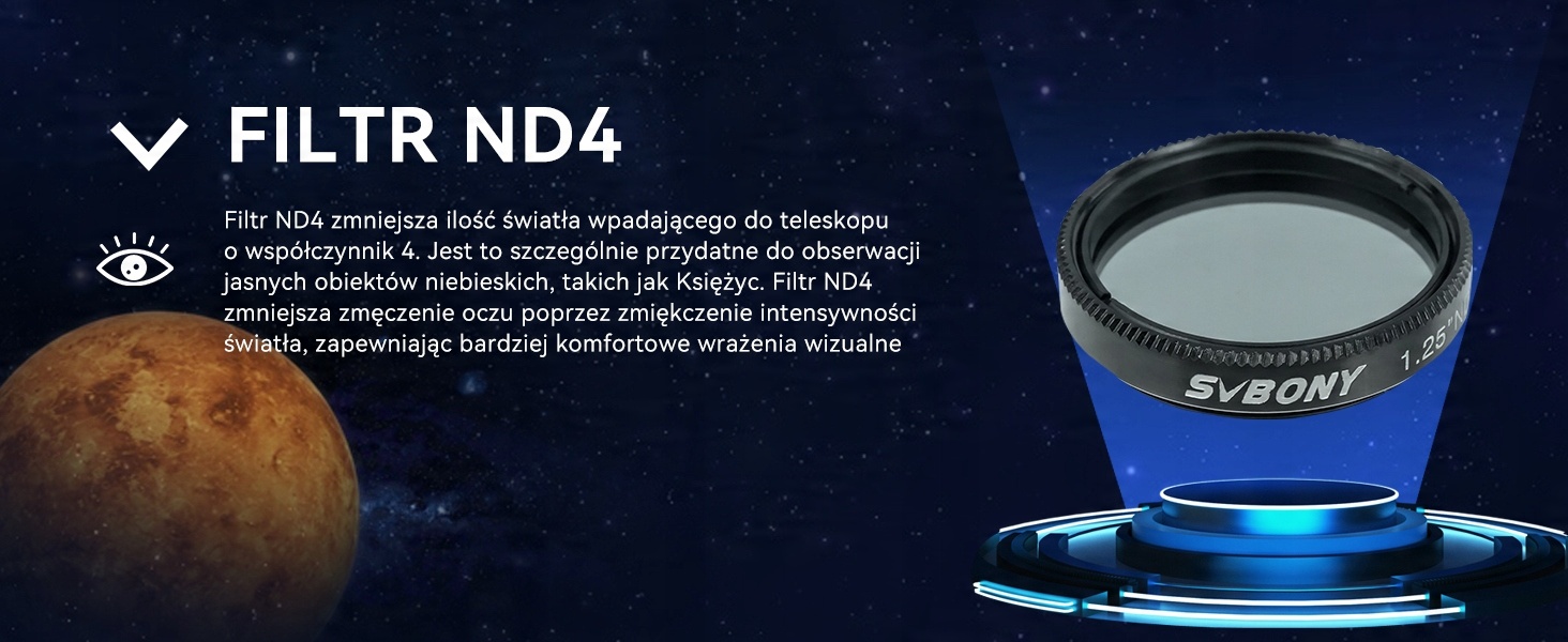 - Фильтр ND4, используемый для наблюдения за фазами Луны, пропускает 25% света, увеличивая прозрачность Луны и ярких двойных звезд.