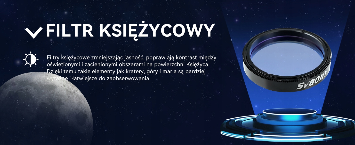 - Лунный фильтр Идеально нейтральный цвет не изменится; естественный цвет Луна усиливает контраст Луны и планет на фотографических изображениях; фильтры подавления светового загрязнения для таких планет, как Марс и Юпитер.