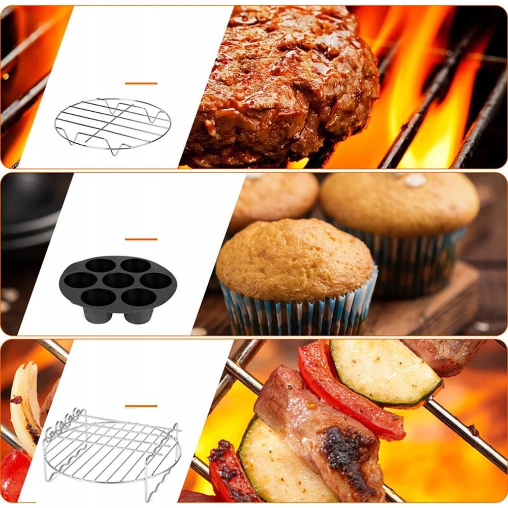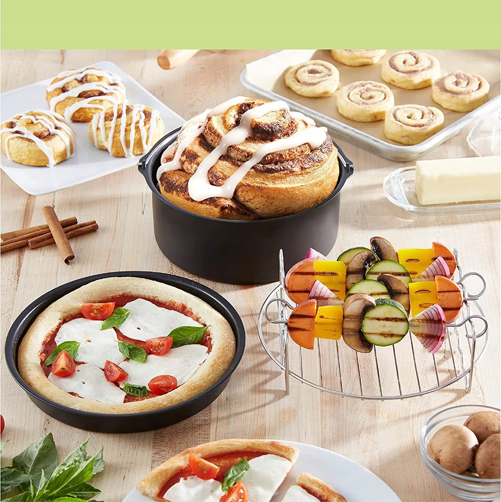 【Многофункциональность】С нашими аксессуарами для аэрофритюрницы вы сможете готовить разнообразные блюда! Выпекайте любимые пирожные в форме для торта, испеките вкусную пиццу на противне для пиццы и готовьте шашлычки на гриле.