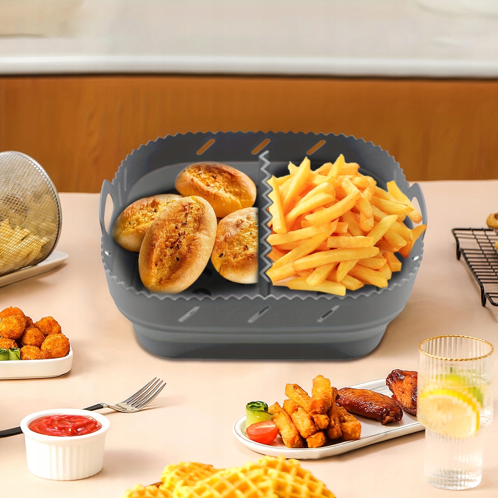 Квадратный силиконовый противень для аэрофритюрницы толщиной 2 мм оснащен отделением, позволяющим легко жарить два разных продукта одновременно. Приподнятая вертикальная конструкция и перфорированное отделение внизу позволяют излишкам масла и жира из продуктов стекать на дно вставки, предотвращая впитывание масла продуктами.