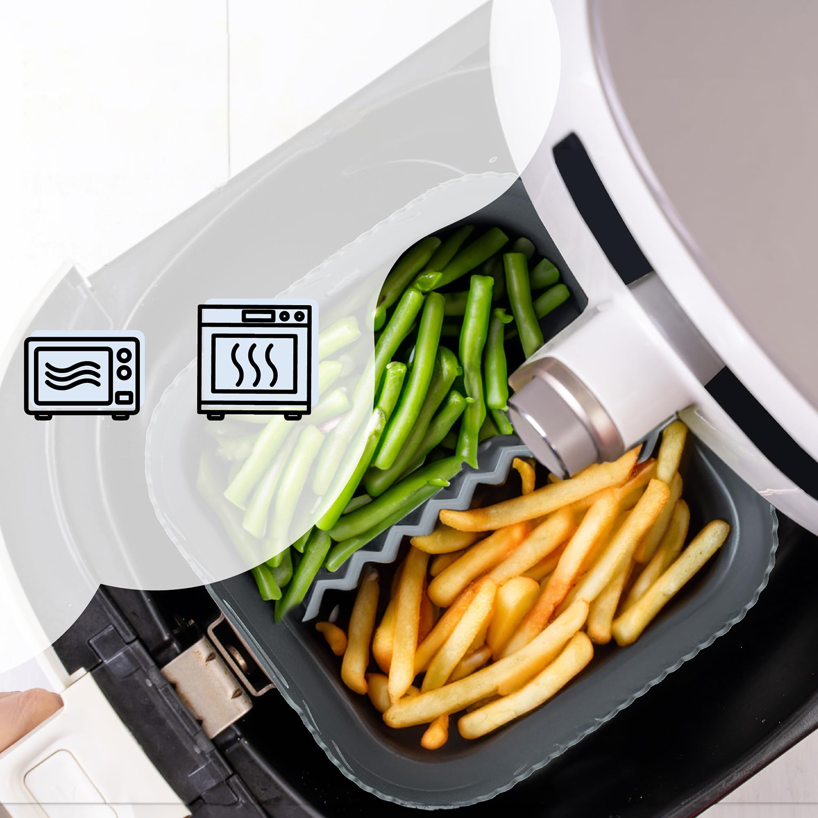 Силиконовый вкладыш фритюрницы можно сложить, что упрощает хранение. Подъемные ручки с обеих сторон позволяют легко переносить еду на тарелку. Изготовленная из 100 % пищевого силикона, вставка не имеет запаха, нетоксична, не допускает пригорания и обладает высокой термостойкостью, поэтому выдерживает температуру до 230 °C/450 °F.