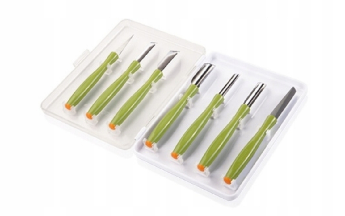 Универсальный набор, идеально подходящий для украшения овощей и фруктов - моркови, белой редьки и редиса, огурцов, кабачков, лука-порея, тыквы, яблок, груш, манго, дыни и т. д.