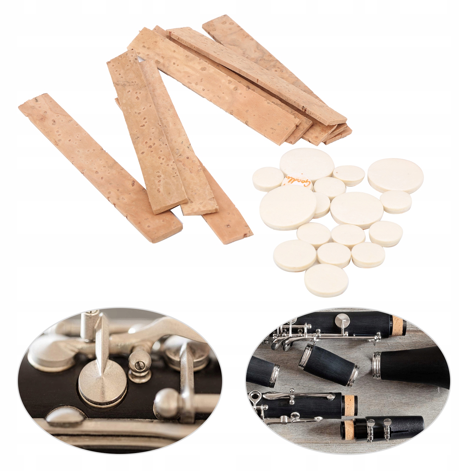 В комплект входят аксессуары: 17 подушечек для кларнета, 10 пробковых листов