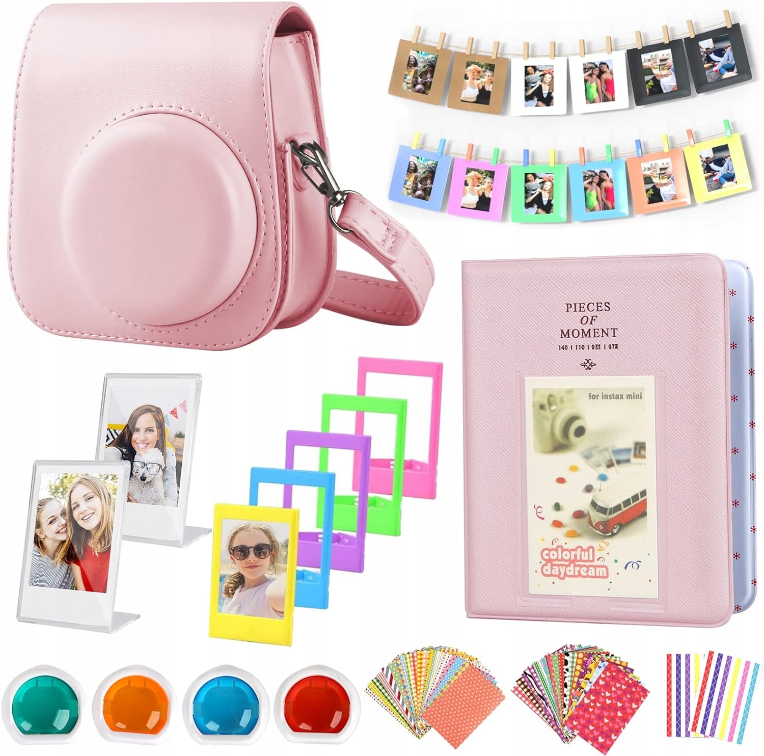 Отличный подарочный набор, совместимый с INSTAX MINI 11 — аксессуары для камеры упакованы в красивую подарочную коробку. В комплект входит: сумка для фотоаппарата из искусственной кожи; фотоальбом; 1 настольный календарь-альбом; 4 штуки цветных фильтров; 5 пластиковых настольных стоек; 20 красочных бумажных фоторамок; 40 фотонаклеек; 2 угловые наклейки для фотографий (камера в комплект не входит). Это идеальный подарок на дни рождения, Рождество, праздники и любые особые случаи, которые вы хотите сделать еще более особенными.