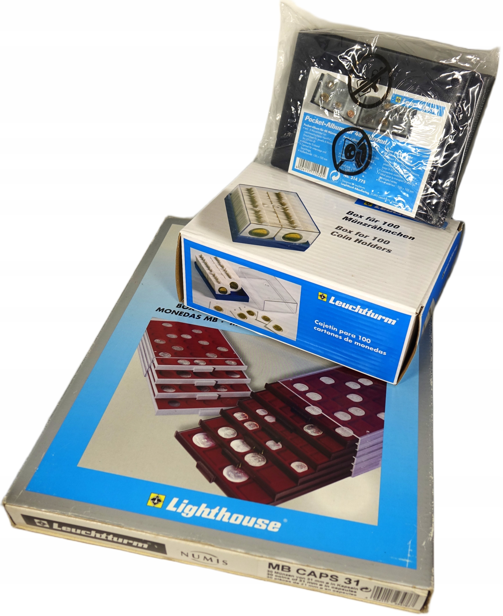 Описание: Состояние новое, набор состоит из поддона на 30 монет, коробки на 100 холдеров и карманного альбома на 48 монет, все в оригинальной упаковке Leuchtturm.