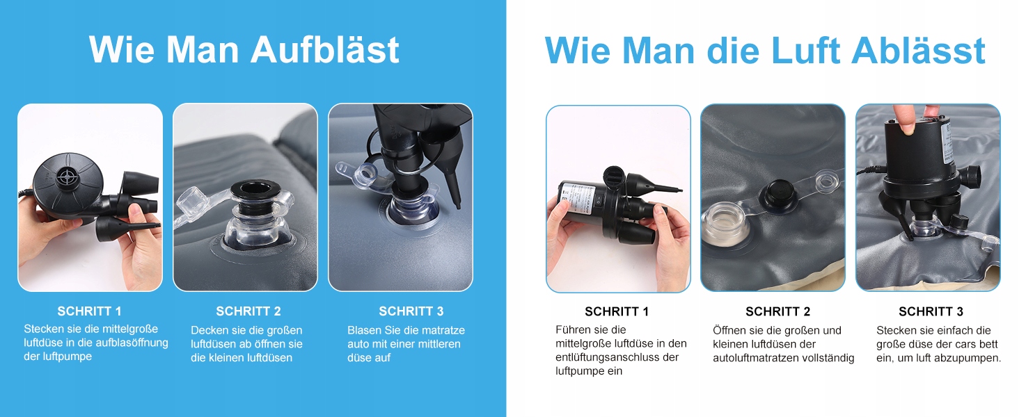 Благодаря электрическому насосу двойного назначения (питающемуся от прикуривателя 12 В) вы можете надуть матрас за несколько минут и так же быстро его сдуть. Все работает интуитивно.