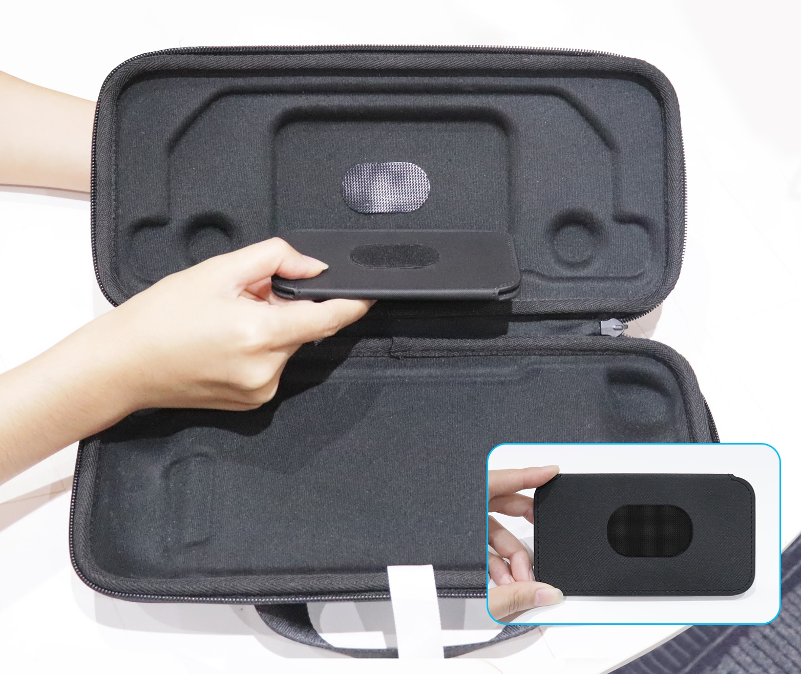 С помощью наклеек можно прикрепить футляр для карт и сумку для аксессуаров к специальной сумке для консоли Steam Deck.
