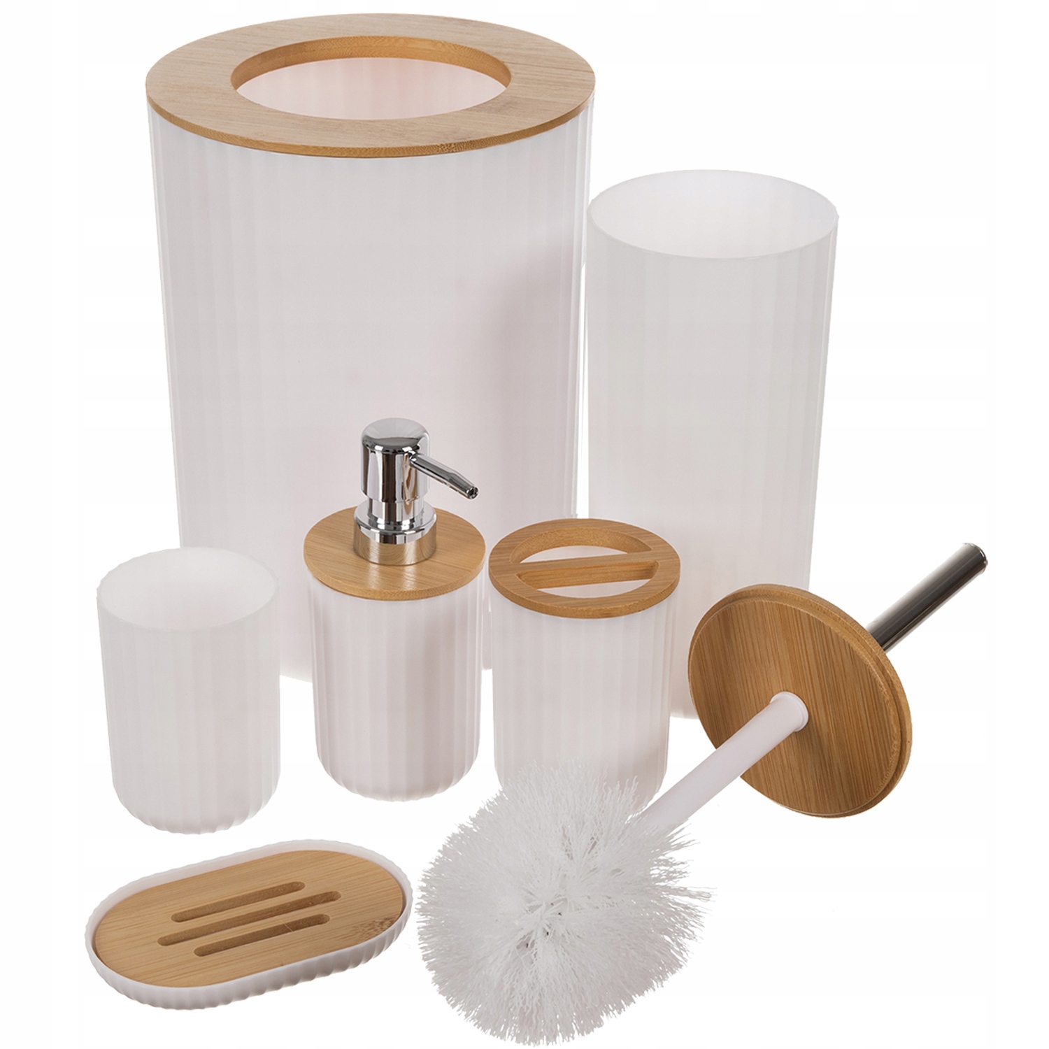 ✔ wysoka Качество набора из 6 аксессуаров для ванной комнаты - набор из 6 аксессуаров для ванной комнаты, изготовленного из высококачественного материала PP с бамбуковыми аксессуарами , является идеальной комбинацией функциональности и элегантности. Белый цвет и гофрированная внешняя поверхность аксессуары знакомятся с внутренними и гигиеной использования .