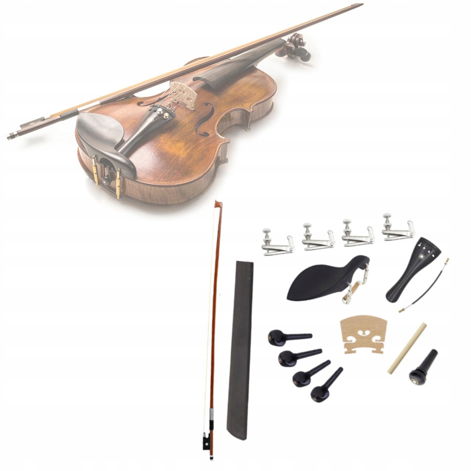 [Комплексный комплект]: этот пакет включает в себя все необходимые компоненты, такие как подставка для подбородка, хвост, звуковая стойка, хвостовая кишка, точный тюнер, звуковая стойка, перемычка, смычок, накладка на гриф.