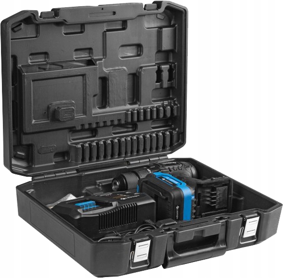 Комплект: Аккумуляторная дрель, отвертка 50 Нм, аккумулятор 2,0 Ач, зарядное устройство 4 А, чемодан