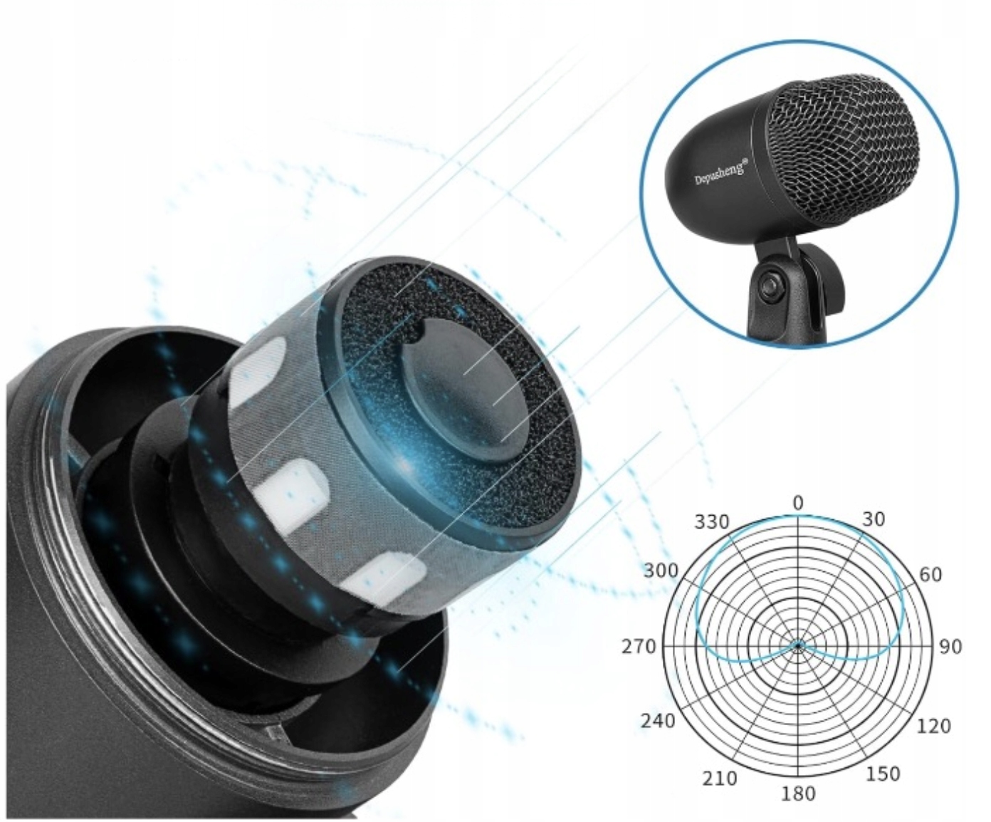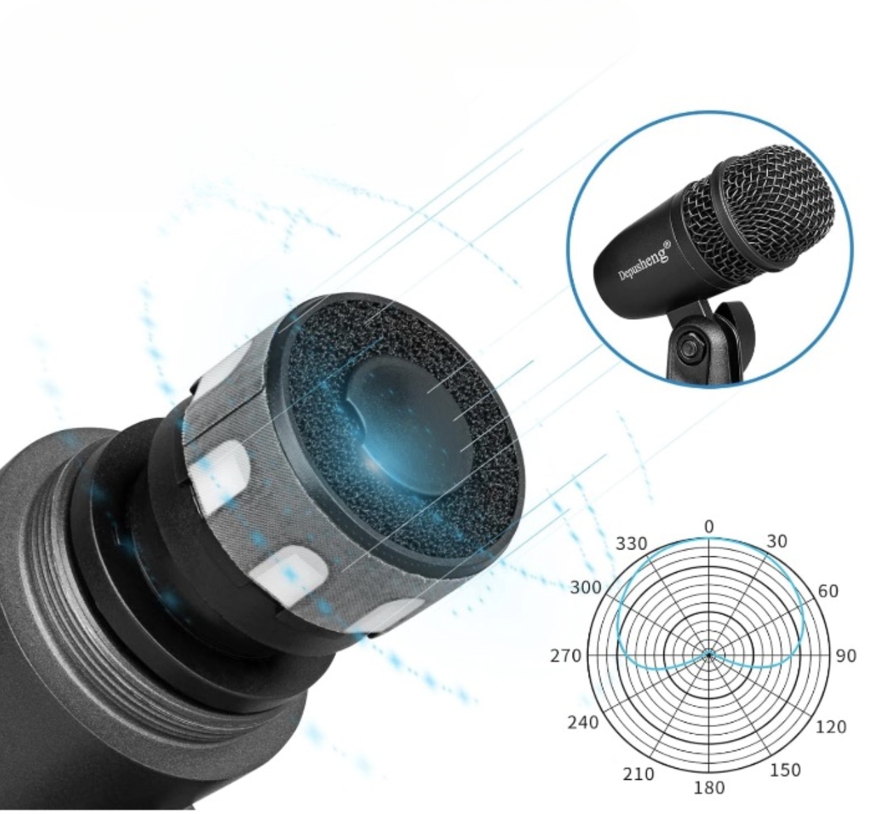 Частотная характеристика формы волны четко воспроизводит звук батарей и ударных инструментов, а кардиоидная диаграмма направленности изолирует основной источник шума и снижает фоновый шум.