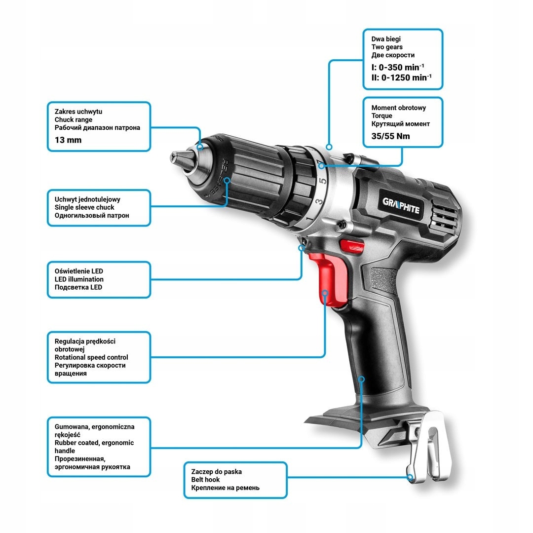 - Аккумуляторная дрель-шуруповерт Energy+ 18 В, Li-Ion, самозажимной патрон 13 мм, без аккумулятора 58G006 ГРАФИТ,