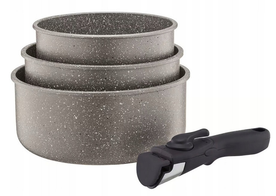 Альтернативное решение для поиска функционального продукта, который не занимает много места в шкафу. Высококачественный алюминий был покрыт уникальным качественным базовым каменным изданием, имитирующим камень с частицами золота, который является долговечным и неживым и обладает хорошим сопротивлением истиранию. Их можно вымыть в посудомоечной машине и использовать в духовке (только ручка должна быть ранее отцелена). Благодаря возможности удаления ручки, одно блюдо может быть спрятано в другом, что занимает как минимум пространство на кухне. Конструкция ручки обеспечивает некоторое и удобное удержание. Набор горшков с съемной ручкой адаптирован для использования на каждом типе печи.