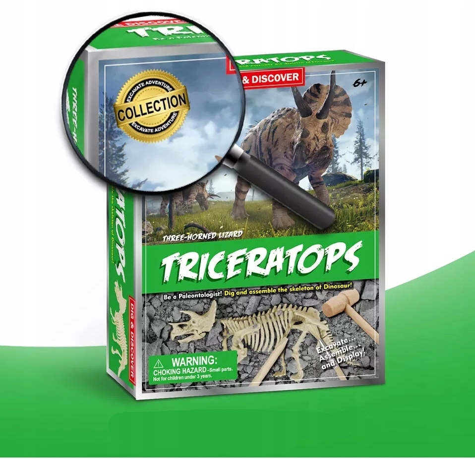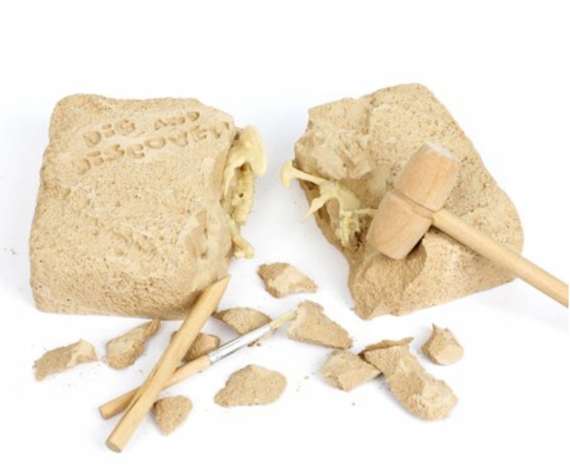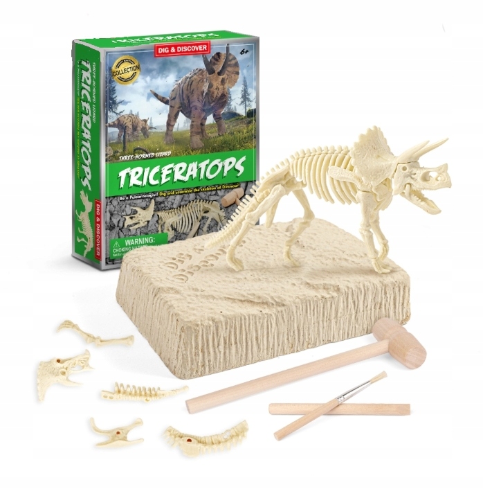 Набор для юного учёного. В блоке спрятан скелет динозавра, который нужно раскопать с помощью инструментов, входящих в набор, а затем соединить кости, чтобы получить скелет трицератопса.