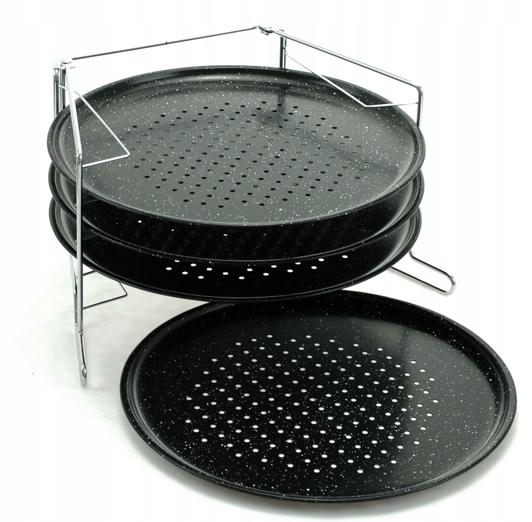 Стоя с четырьмя плотными духовками с 4 форм пиццы диаметром 32,3 см. Перфорированное дно бляшек заставляет запеченную пиццу иметь хрустящее дно. Листы очень долговечны благодаря свернутым берегам. Их можно вымыть в посудомоечной машине.
