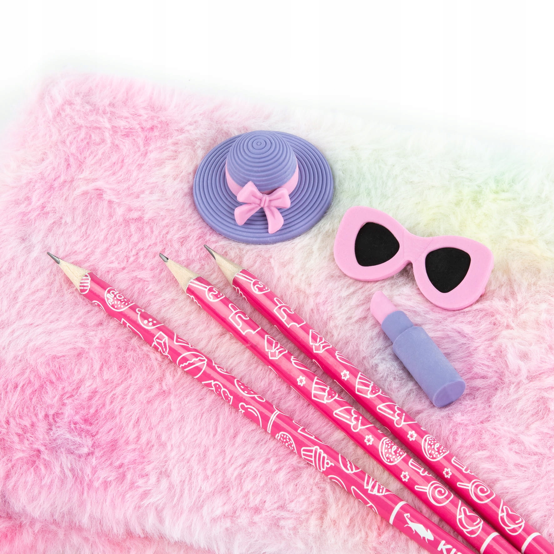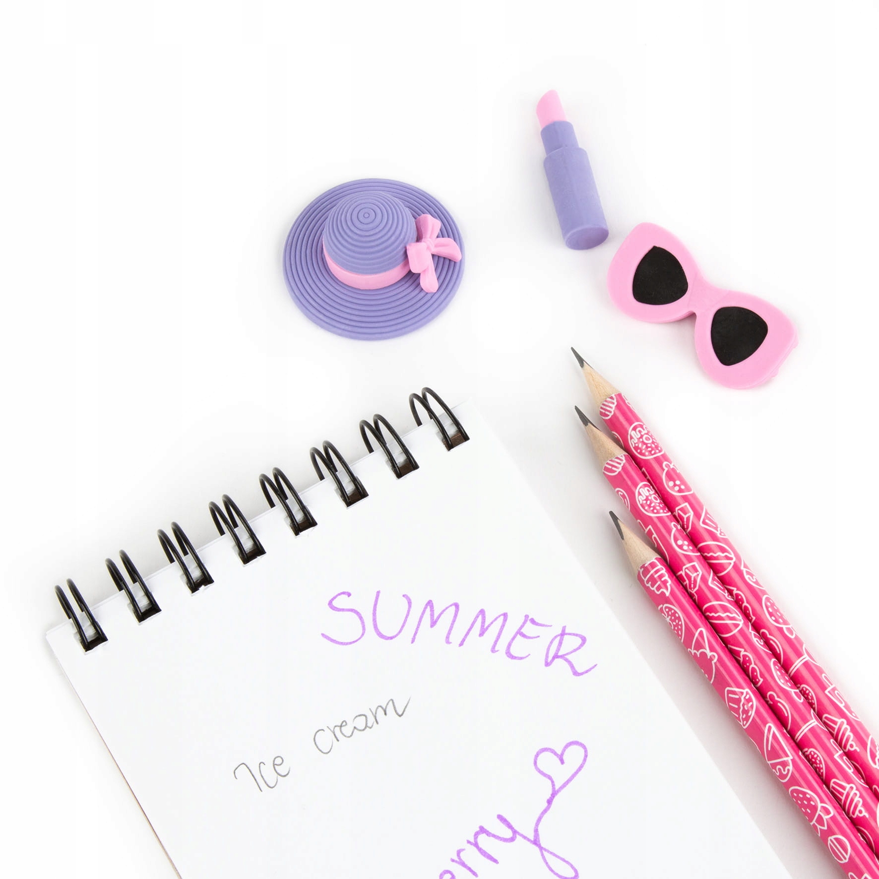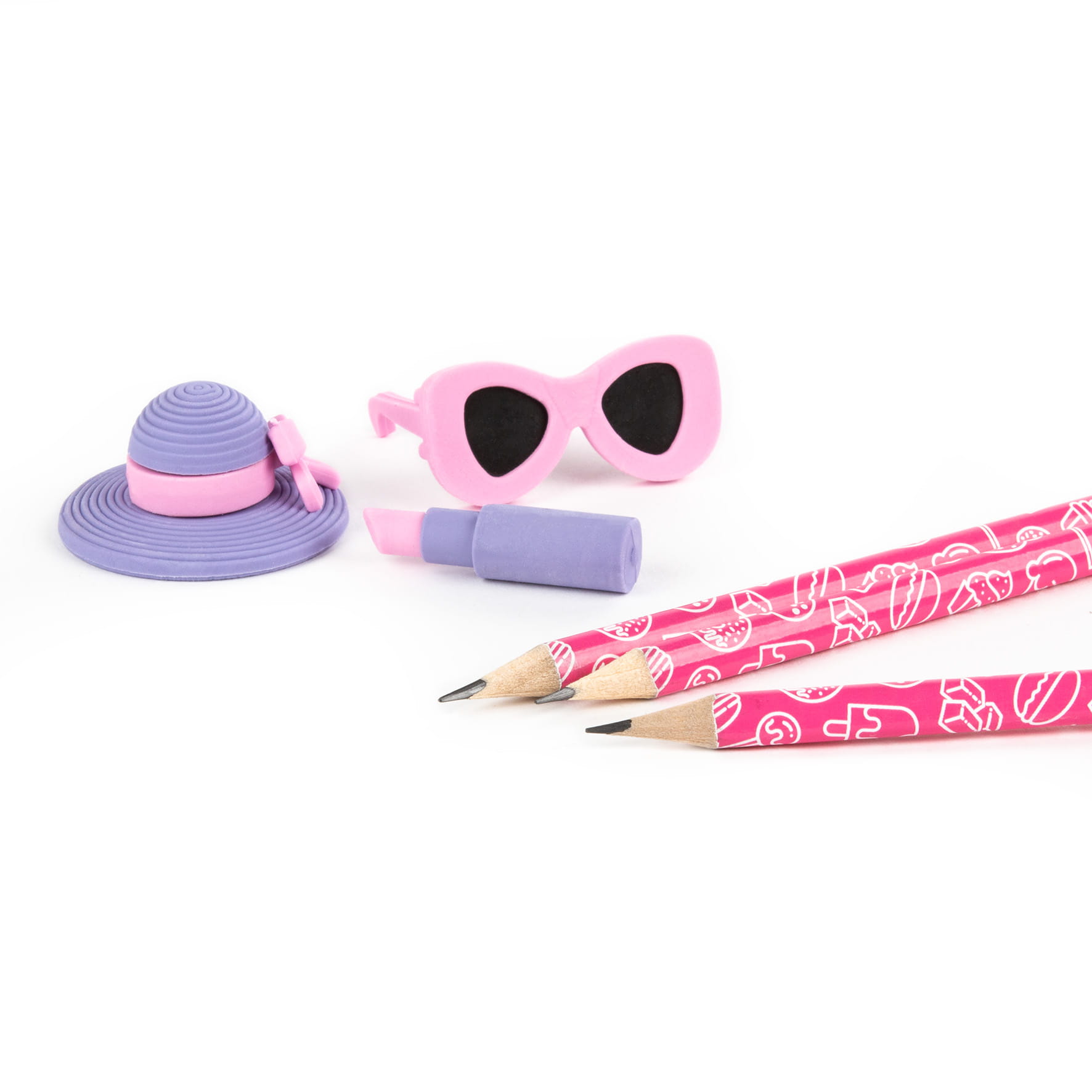 содержит 3 карандаша с твердостью стилуса Hb и тремя ластиками в форме вкусовых звезд.