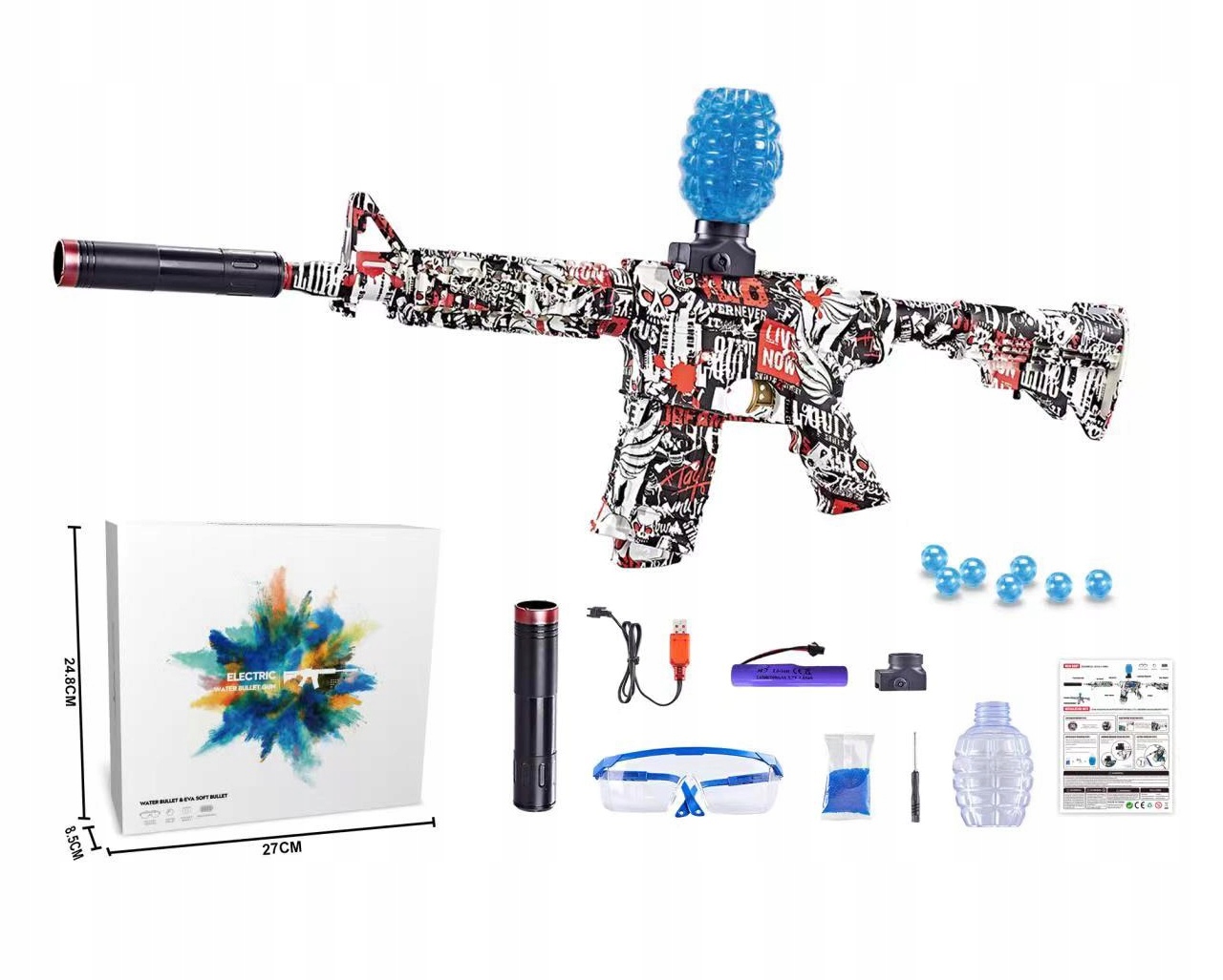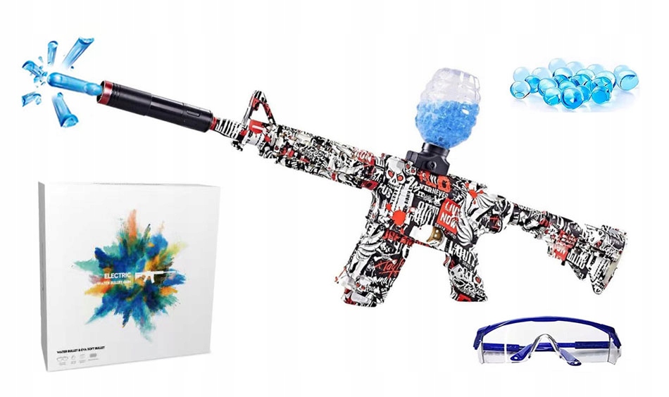 В наборе есть все необходимые элементы. Просто подключите аккумулятор, используйте шарики, и все готово! В упаковке содержится целых 8000 картриджей с водой. Они полностью безопасны, врезаются в препятствия, поэтому их можно использовать и в помещении. Очки, входящие в комплект, дополнительно повысят безопасность во время съемки.
