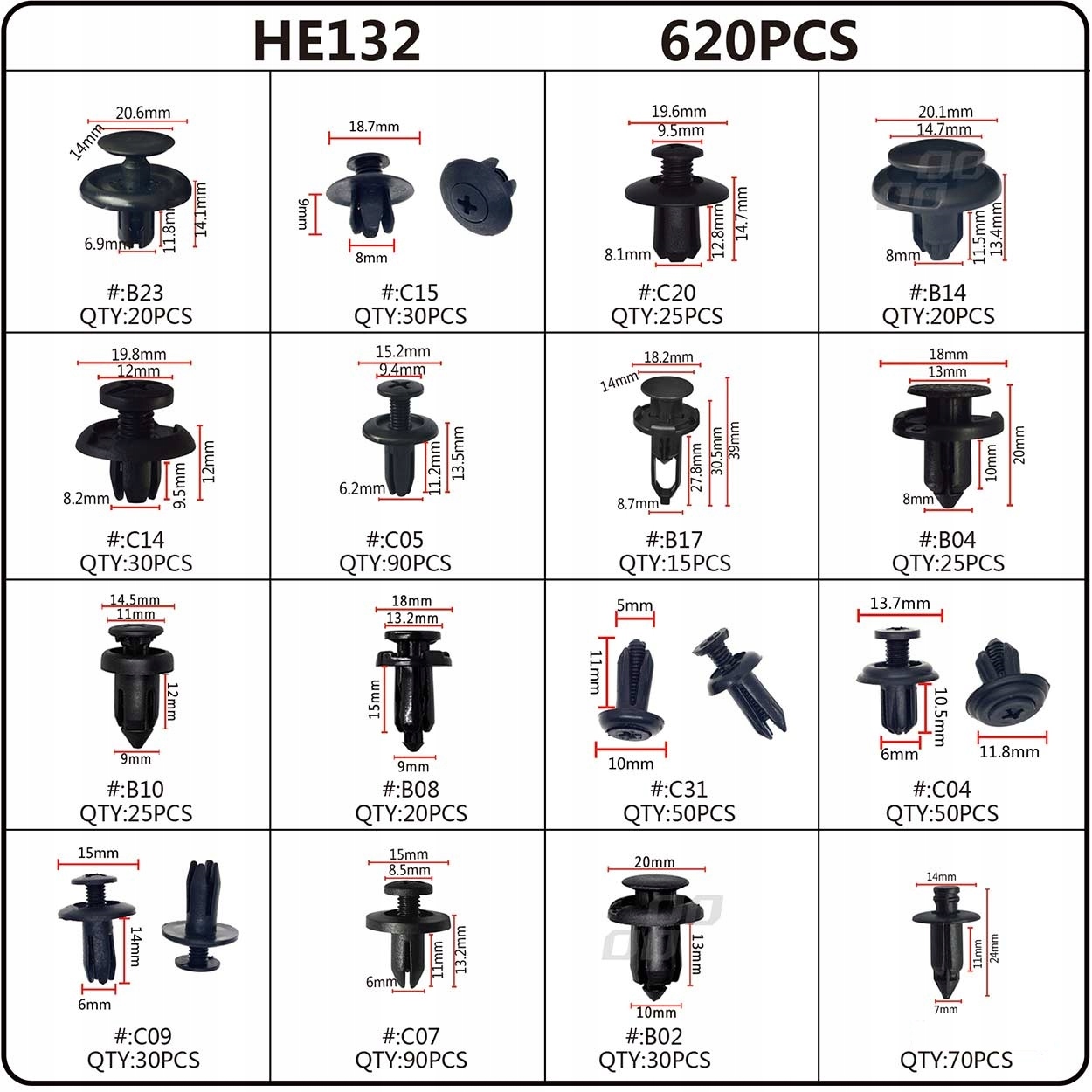 Набор из 620 ЭЛЕМЕНТОВ, включая 16 самых популярных размеров зажимов и монтажных разъемов.
