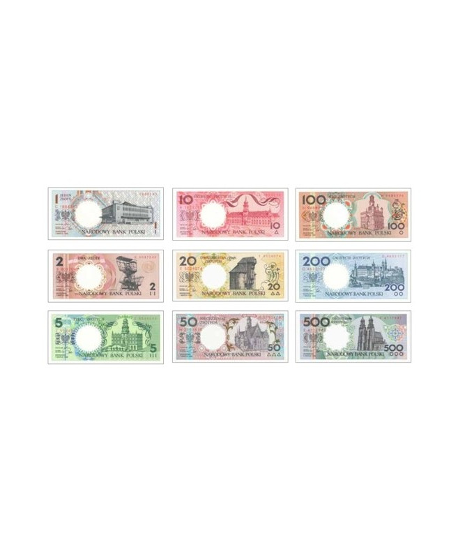 1 PLN Гдыня, 2 PLN Катовице, 5 PLN Замостье, 10 PLN Варшава , 20 PLN Гданьск, 50 PLN Вроцлав, 100 PLN Познань, 200 PLN Краков, 500 PLN Гнезно