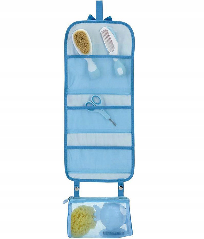 Набор первых аксессуаров, необходимых для гигиены и комфорта новорожденного, заключенных в практичную косметичку, которую можно повесить на стену, для использования дома и в путешествии.