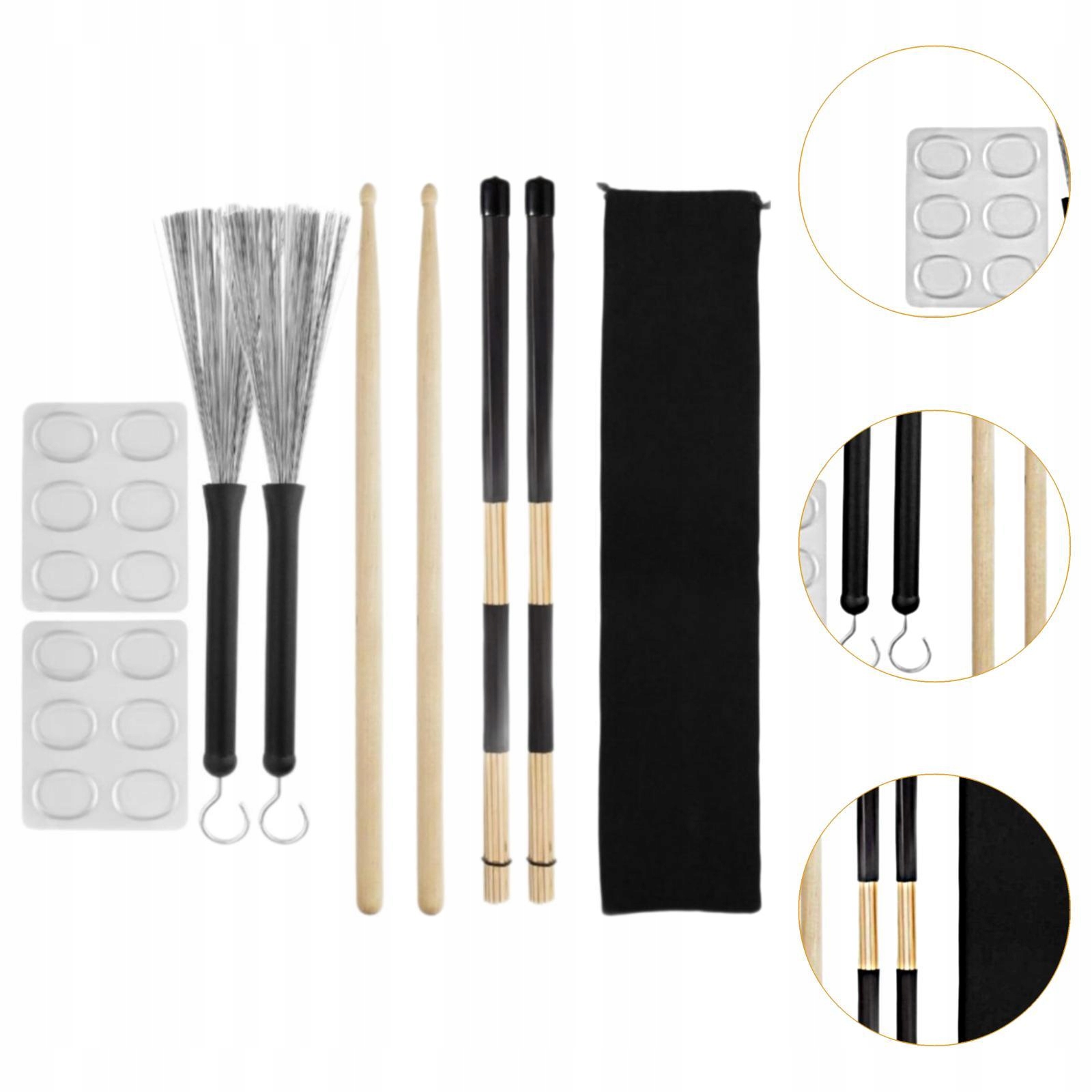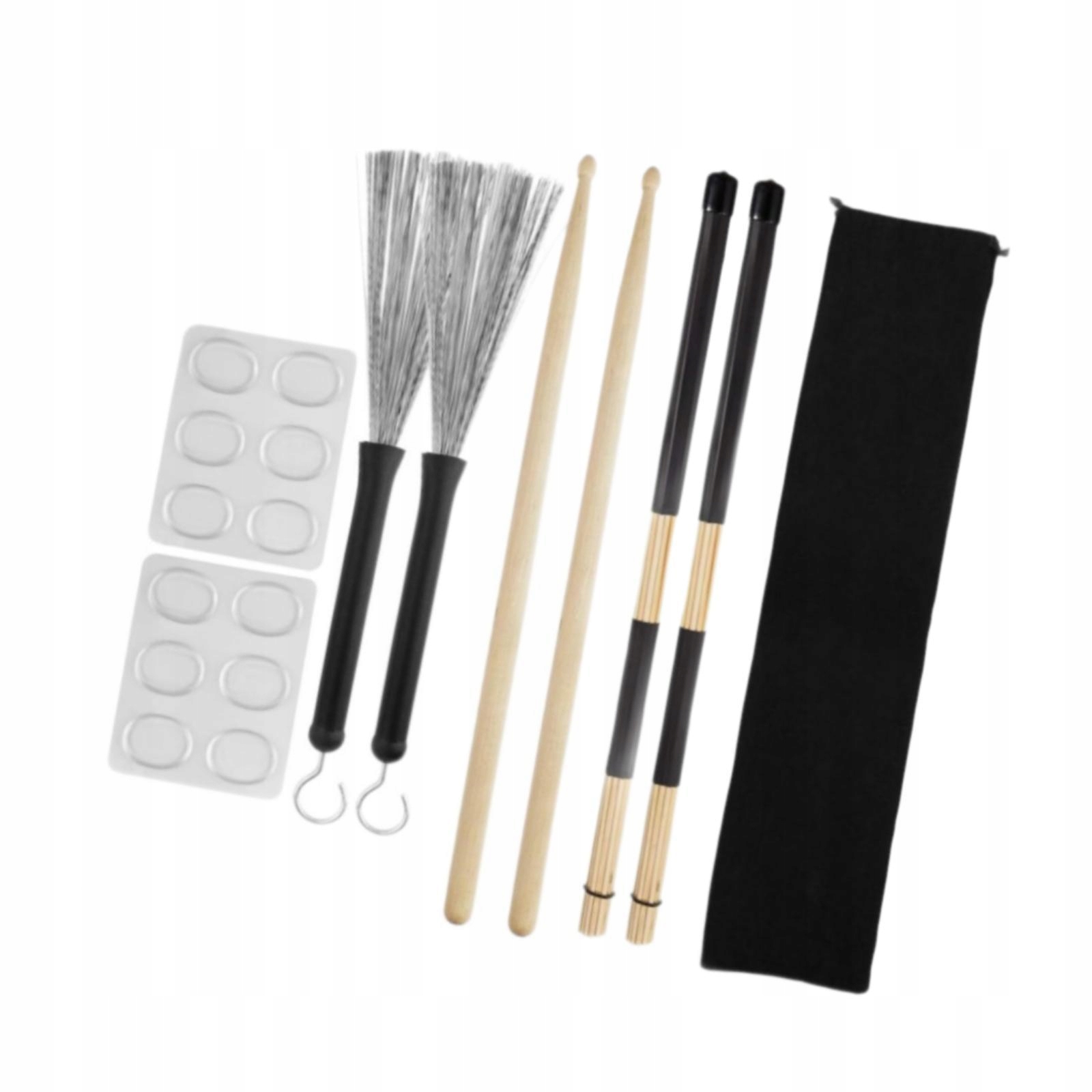 [Упаковка]: содержит 2 деревянные барабанные палочки, 2 щетки для барабанных палочек, 2 металлические барабанные щетки, 2 силиконовые подушечки, 1 бархатный мешочек.