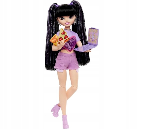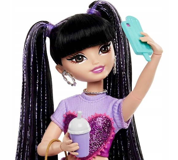 - аксессуары для куклы: смузи, крендель, кусочек пиццы, мобильный телефон в чехле, пакетик чипсов, пакет в форме тоста, ноутбук.
