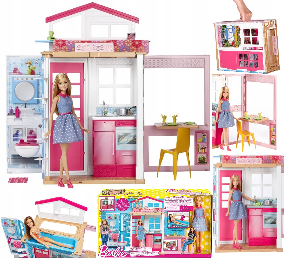 Дом спроектирован так, чтобы его было легко переносить. Раздвиньте его стены, чтобы открыть два уровня с большим количеством места для игры. Вы найдете кухню с раковиной и плитой, а также ванную комнату с туалетом и душем. Создайте гостиную, разместив телевизор вертикально, или столовую, разместив его горизонтально и превратив в обеденный стол – элегантное кресло подойдет к обоим интерьерам. Переверните кровать, и на втором уровне появится роскошная спа-ванна! Дополнительные аксессуары (покрывала на двоих, кастрюля, мыло, расческа, планшет, часы, полотенце и плед) делают веселье еще привлекательнее. После того, как вы закончите играть, вы можете сложить домик и спрятать его или переместить в другое место — дополнительная ручка делает домик чрезвычайно удобным для транспортировки. Барби выглядит очаровательно в джинсовом платье в белый горошек с розовыми вставками, а розовые сандалии дополняют ее модный стиль. В набор входит кукла Барби и домик с мебелью и аксессуарами.