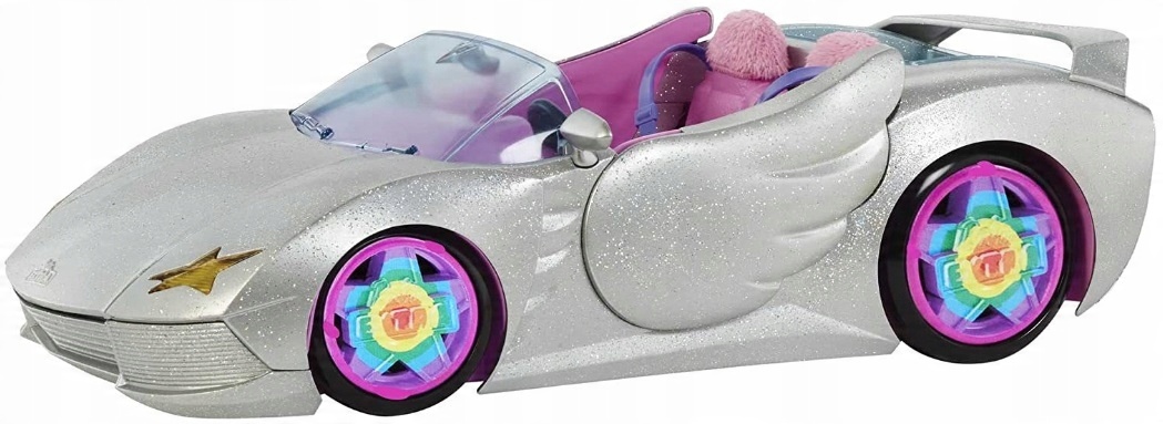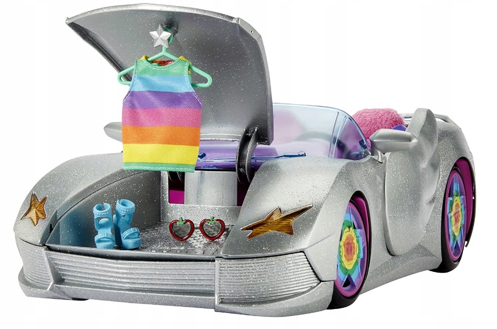 Автомобиль двухместный, имеет подвижные колеса, что позволяет ему передвигаться по ровной местности. Автомобиль выделяется своими спортивными линиями, детализированными деталями, элегантным розовым интерьером и реалистичными деталями, такими как ремни безопасности и зеркало заднего вида. Особого внимания заслуживают разноцветные колеса и крутые фонари в форме звезд. Чтобы куклы чувствовали себя комфортно в машине, сиденья имеют мягкие, плюшевые подголовники. В набор также входит друг Барби — собака чихуахуа и аксессуары, такие как очки, туфли, красочная блузка и спасательный круг. Состав набора: