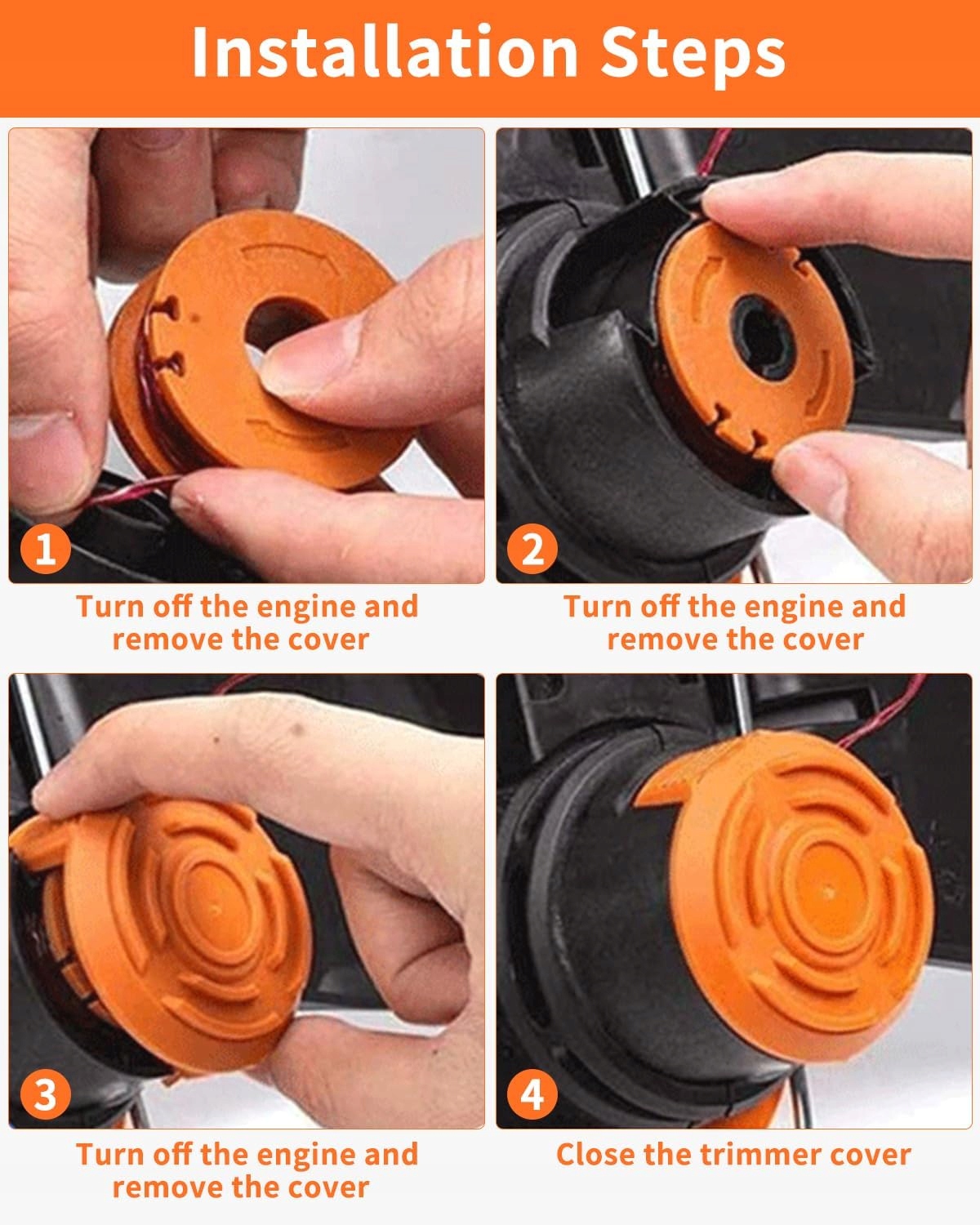 Каждая катушка кузнечика предварительно является вдворной, она не требует использования инструментов и может быть заменена за несколько секунд. Профессиональная резание с ЧПУ и автоматическая обмотка безопаснее и быстрее, чем ручная обмотка, уменьшает повреждение косилки и не запускает во время косителя