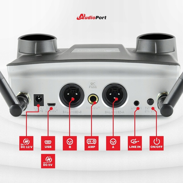 Базовая станция Audioport MCD-U2-это универсальный приемник UHF со встроенной системой зарядки индукции, которая обеспечивает удобную и быструю зарядку микрофонов. Он оснащен двумя сбалансированными выходами XLR, запертыми 1/4 '' '' выходами для микрофонов MIC1 и MIC2 и BNC антенны антенны. Большой ЖК -дисплей и интуитивно понятная панель управления позволяют легко работать и регулировать параметры. Эффективный эксплуатационный диапазон до 50 метров и стабильности частоты (+10PPM) гарантирует надежность даже в требовательных условиях.