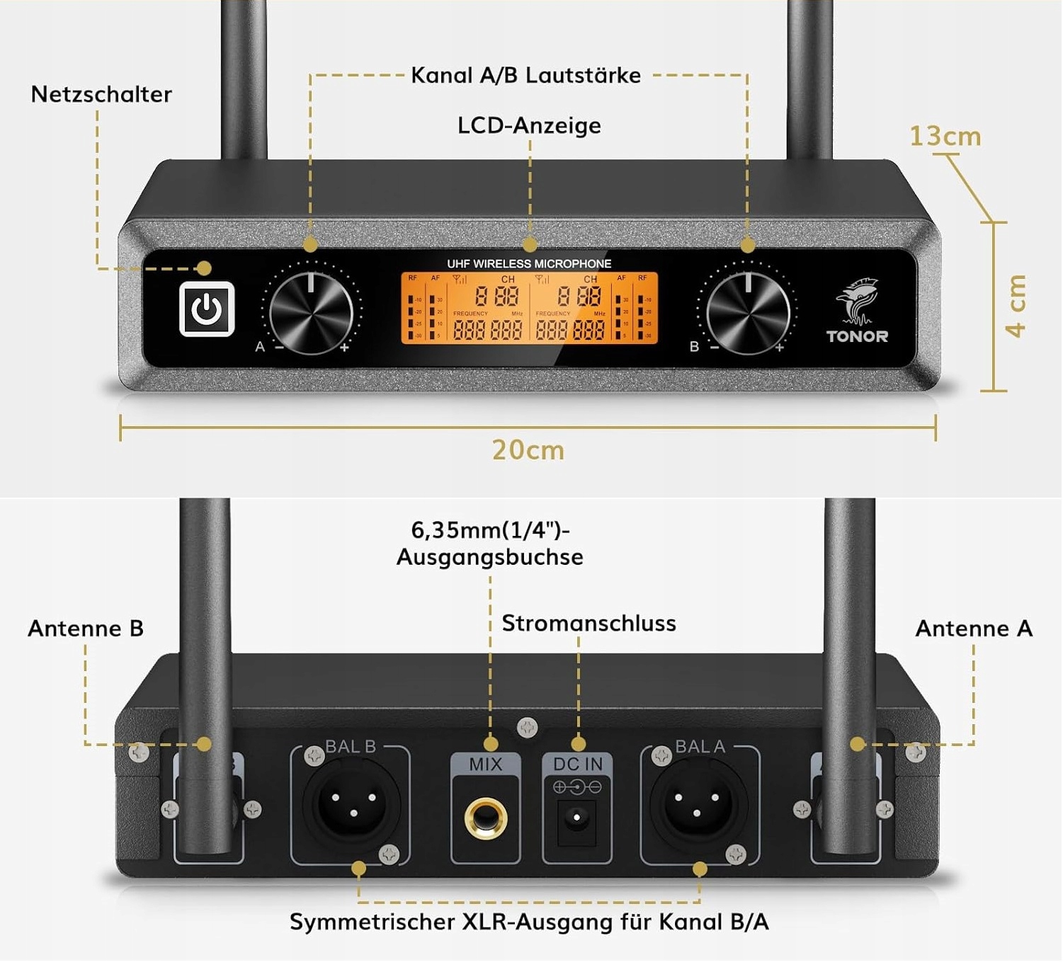 ⋆ Легкая работа: После правильного соединения и начала устройства микрофон и приемник автоматически согласуются. Дальнейшие шаги не требуются. Тонарский радио микрофон обеспечивает отличный звук от надежной радиосистемы. Для работы необходимы 4 батареи AA, которые не попадают в пример доставки и могут использоваться в течение 12 часов. Это очень долговечное и долговечное. Металлический входящий ящик оснащен ЖК -дисплеем, на котором частота, сигнал, уровень батареи и другая информация ясно видны на первом взгляде