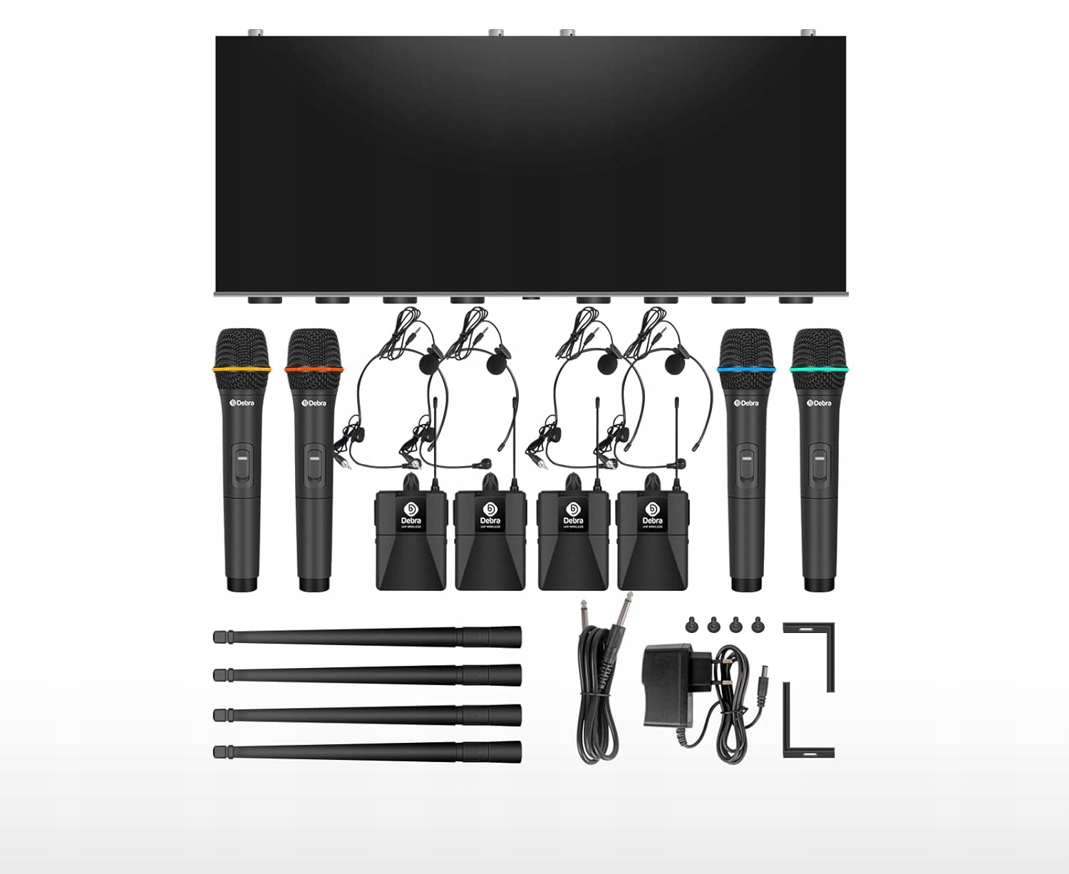 Список содержимого упаковки: беспроводной приемник * 1, ручной микрофон * 4, поясной рюкзак * 4, микрофон гарнитуры * 4, петличный микрофон * 4, антенна * 4, аудиокабель * 1, адаптер питания * 1, код угла * 2, винты * 4, инструкция * 1.