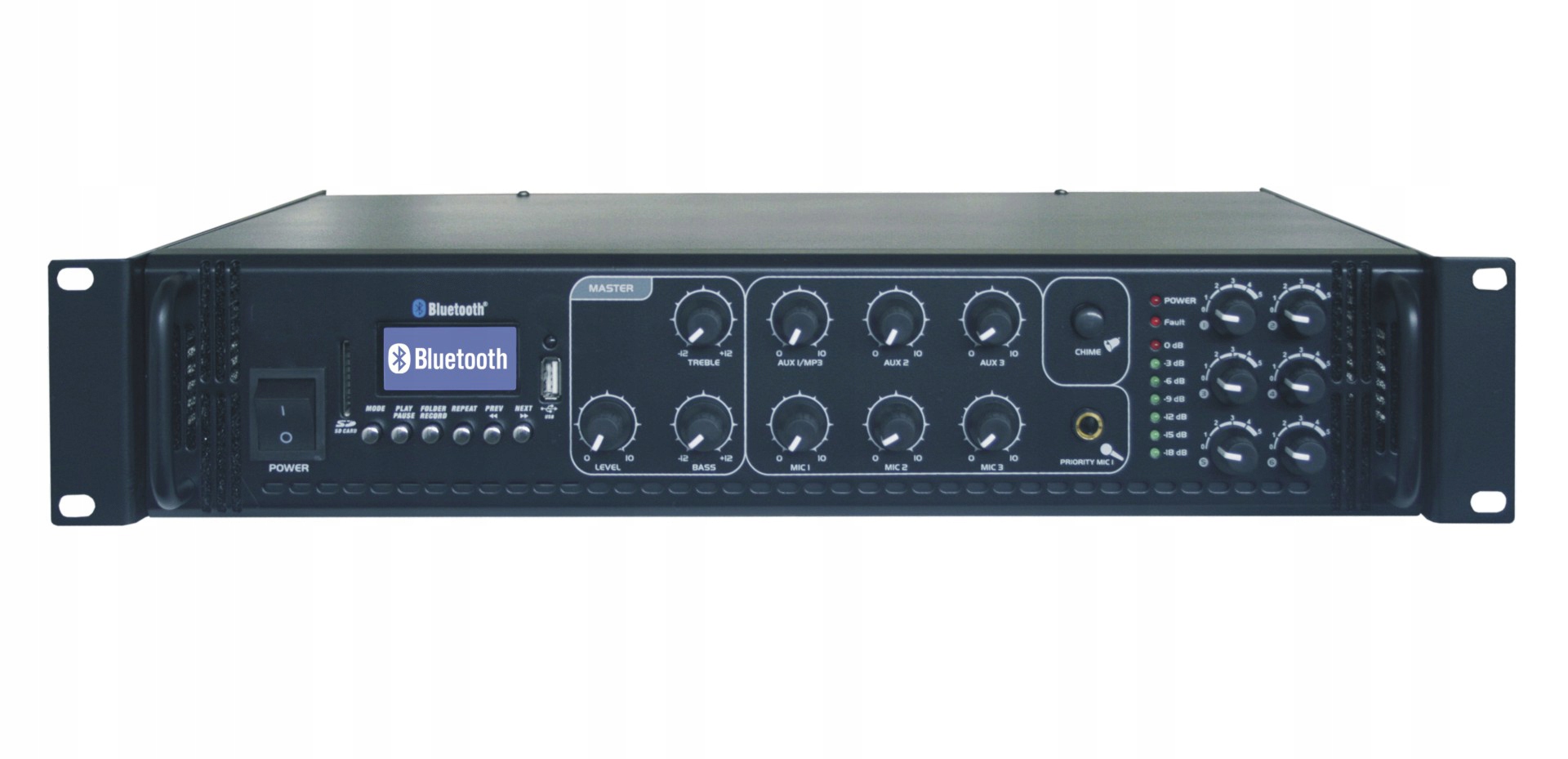 Входы: 3 x MIC (MIC с функцией приоритета), 3 x AUX, встроенный MP3-плеер - данные с внешнего USB память или SD-карта. Подключение Bluetooth для устройств, оснащенных Bluetooth, например мобильных телефонов. Светодиодный индикатор уровня выходного сигнала MASTER VOLUME, общая коррекция низких и высоких частот.