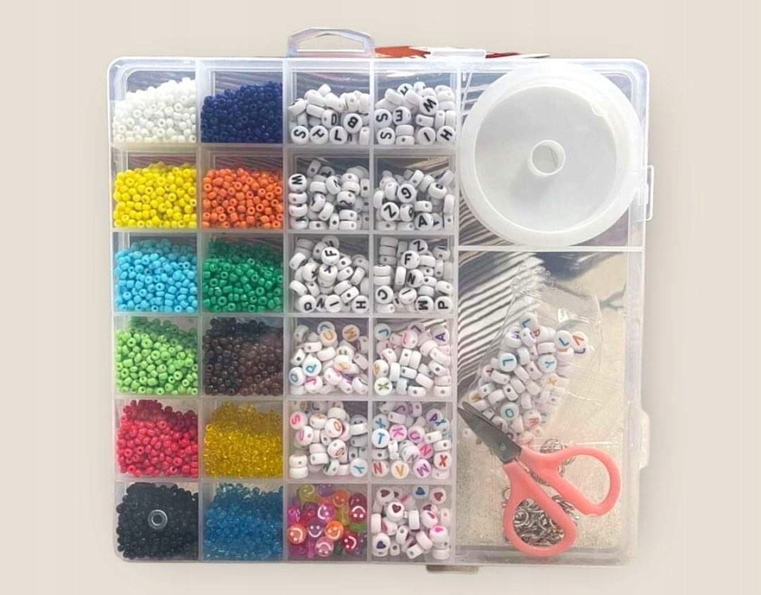 Буквы и бусины упакованы в практичный закрытый органайзер с 26 отделениями.