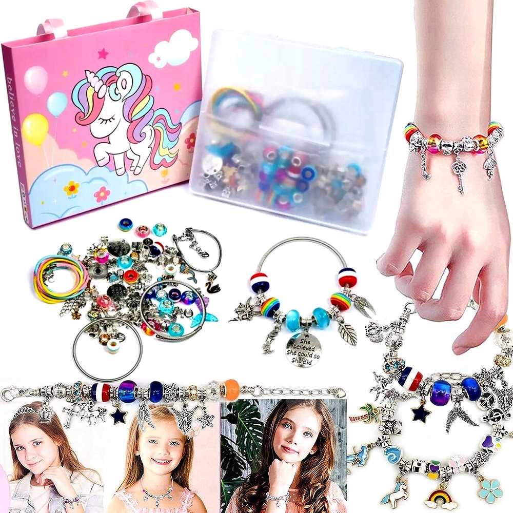 В комплект входят стеклянные, смоляные и металлические бусины различной формы, а также металлические бусины с различными подвесками. Все элементы можно нанизать на один из трех браслетов регулируемой длины.