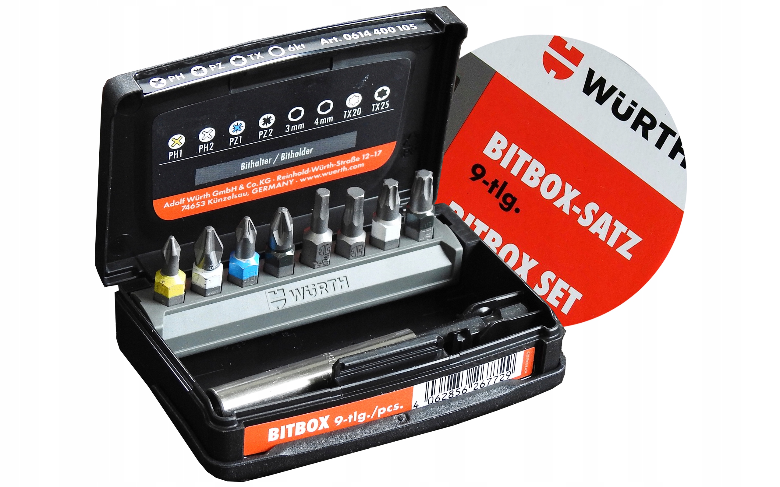 Набор бит WURTH, держатель 1/4" PH PZ TX, 9 элементов, практичная коробка