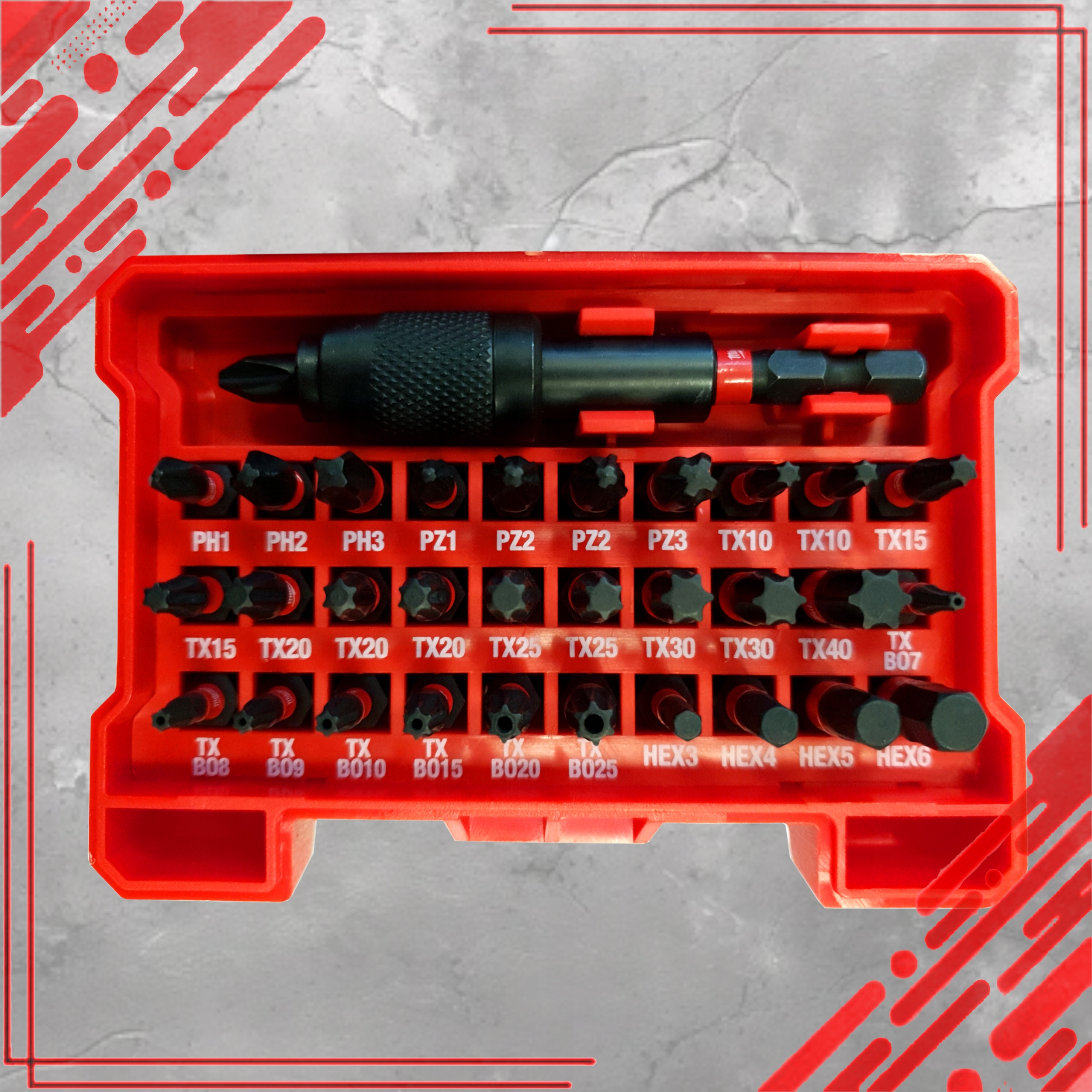 НАБІР БІТ IMPACT DURABLE TORX PZ PH SHOCKWAVE БІТИ РУЧКА 32 ШТ.