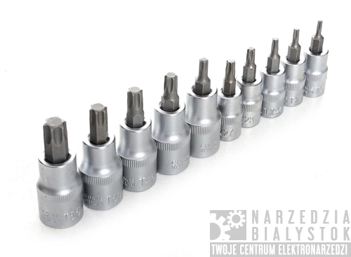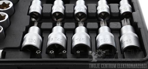 - 5 шт. Головки с битами на 3/8": Т10, Т15, Т20, Т25, Т27 <ли>5шт. Головка с битами на 1/2": Т30, Т40, Т45, Т50, Т55